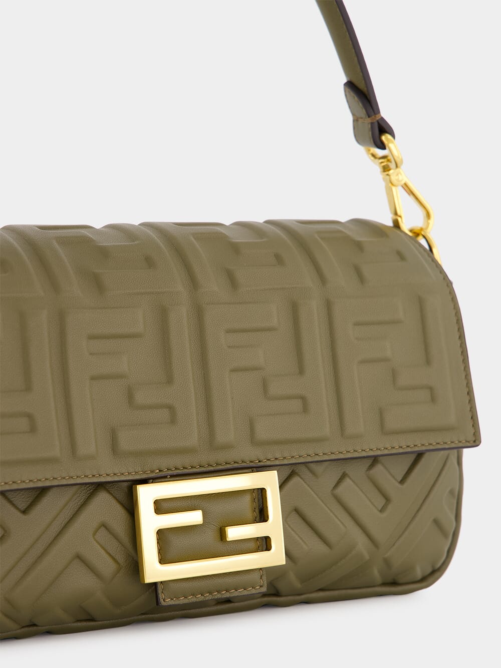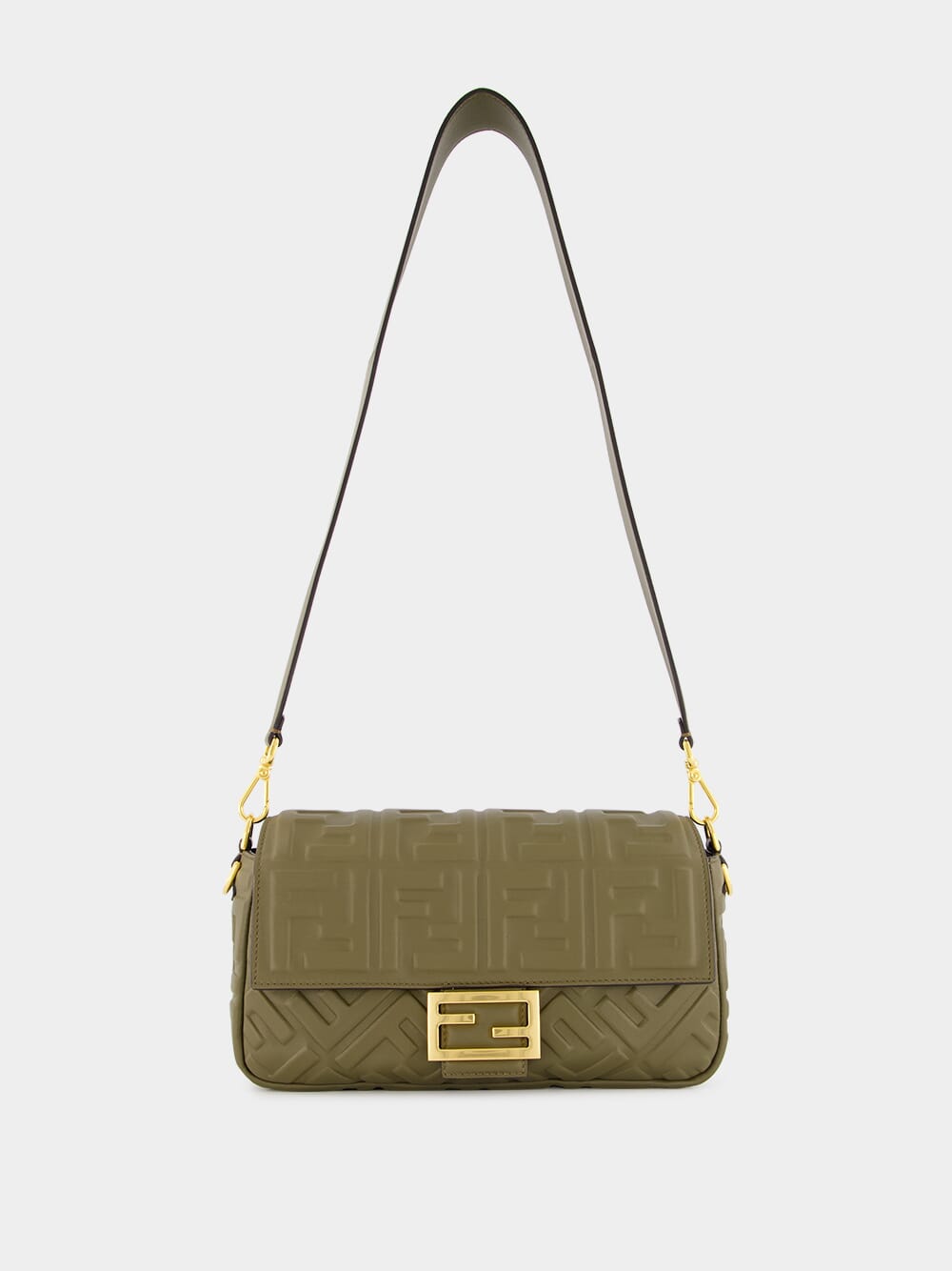The iconic medium Baguette bag, originally created in 1997, has become a timeless It bag. Versatile with an enduring appeal, it showcases the classic underarm design inspired by the French Baguette bread. Crafted from soft green nappa leather with a 3D-effect embossed FF motif, it is adorned with an FF clasp. It features a front flap, a magnetic clasp, an internal compartment lined in fabric with a zip pocket, and vintage gold-finish hardware. The bag can be carried by hand or worn on the shoulder or cross-body, thanks to the detachable handle and shoulder strap.