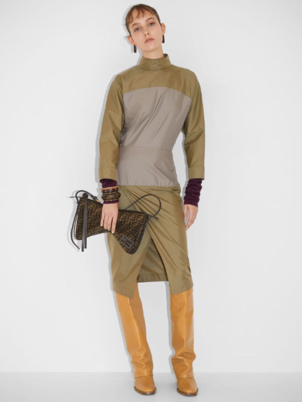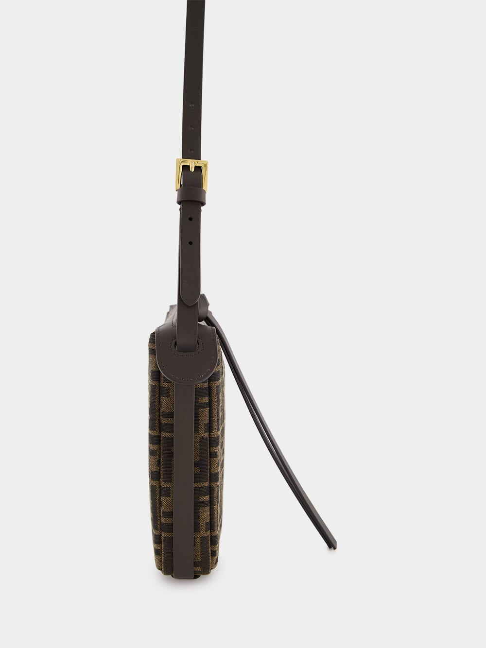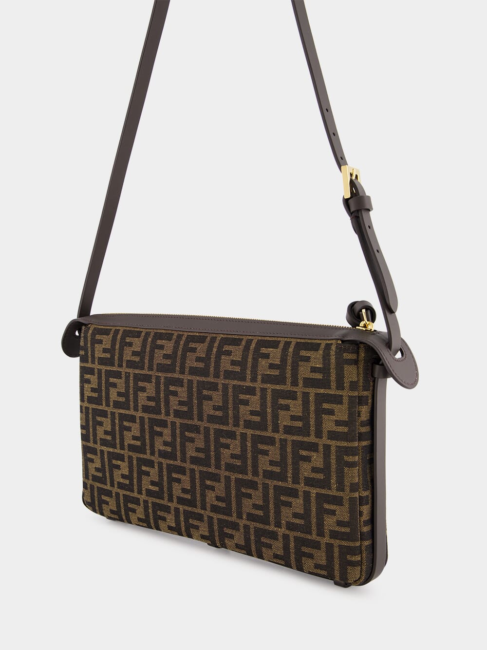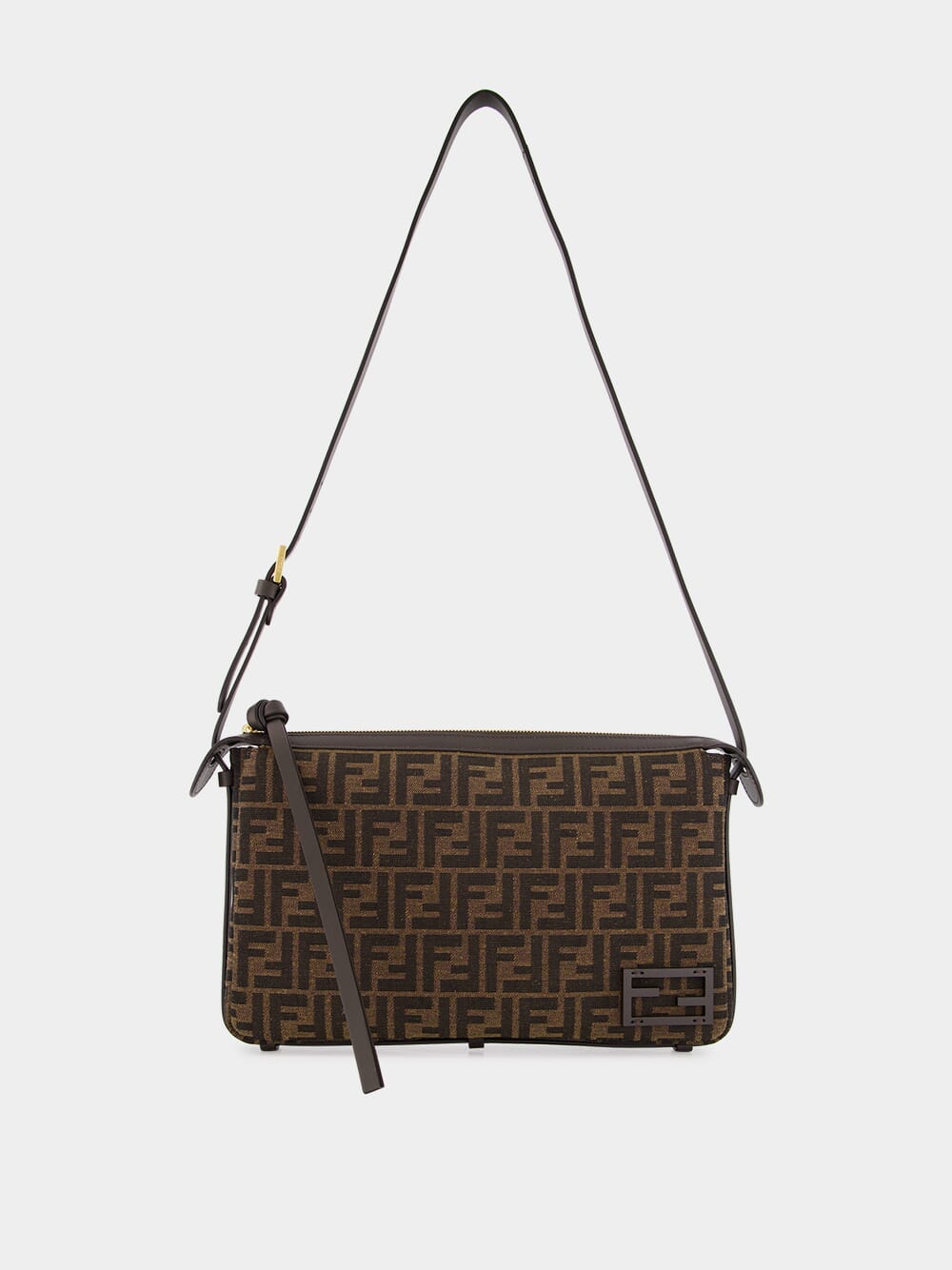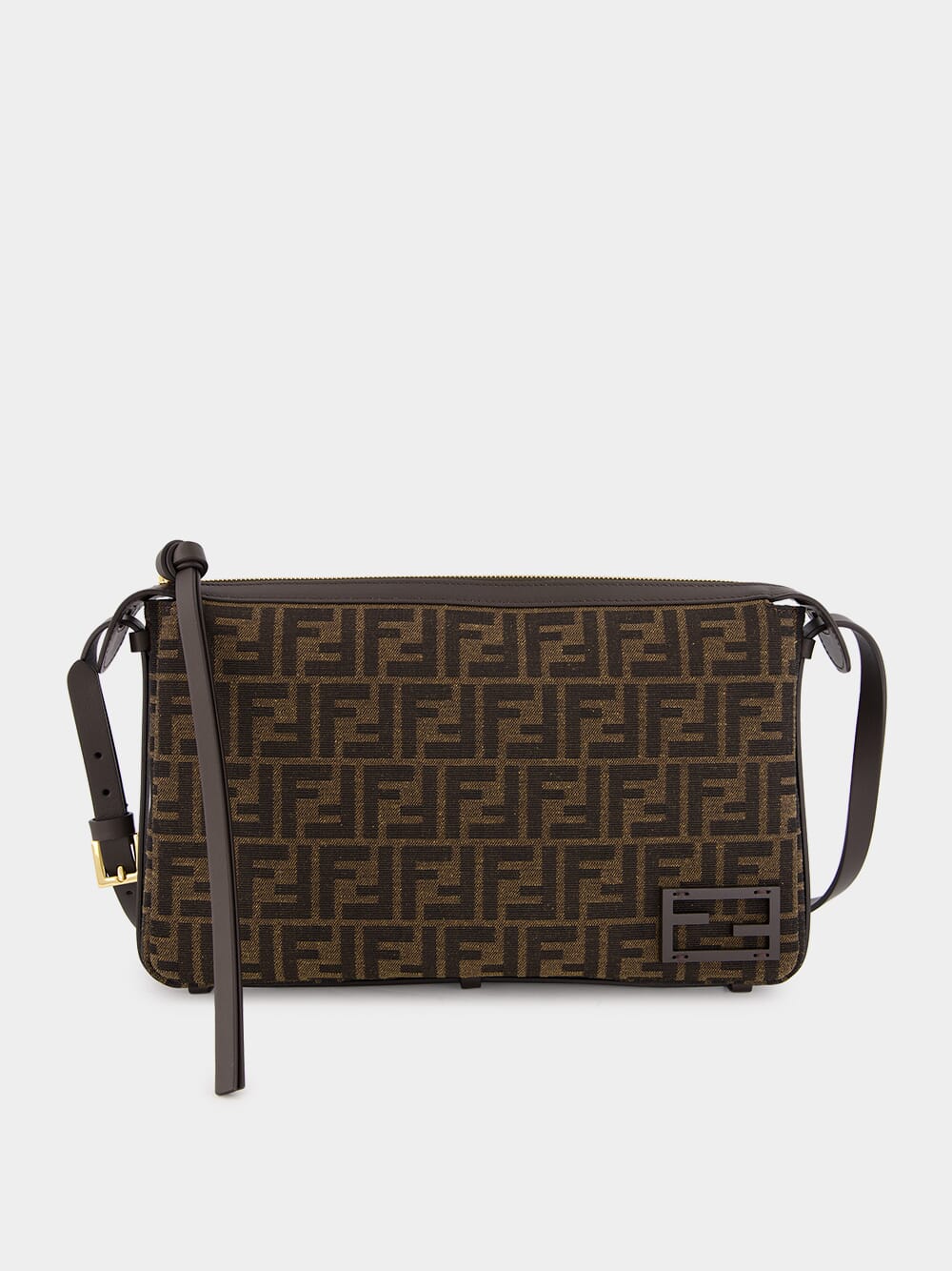 The Medium Simply Fendi bag is a soft shoulder bag, presented at the Fall-Winter 2024/25 fashion show, named for its elegant and essential design inspired by a 1990s archive style. Crafted from jacquard fabric featuring the iconic brown FF motif, it is adorned with dark brown patent leather FF embellishments. The bag is closed with a long dark brown calfskin zip-pull with a knot and features an internal lined compartment with a zip pocket and gold-finish hardware. It can be worn on the shoulder or cross-body, thanks to the adjustable shoulder strap.