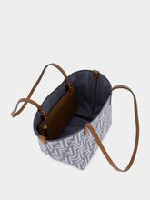 The Small Roll shopper bag features a reversible design with blue denim-effect FF jacquard on one side and tone-on-tone jacquard on the other. Crafted with refined Selleria leather handles in brown calfskin and detailed with hand-stitched macro topstitching, it includes a removable zip pocket and gold-finish hardware. A timeless and functional accessory for versatile styling.