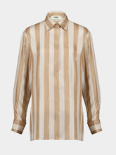 This relaxed-fit silk shirt features the iconic Pequin stripes in beige and cream. It has a shirt collar and long sleeves with dropped shoulders, offering a comfortable yet stylish look. The front fastening includes concealed buttons for a sleek appearance. Perfect for adding a touch of luxury to your wardrobe.