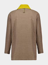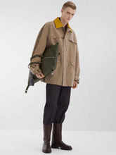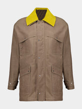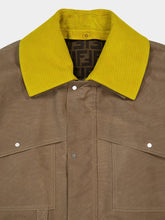 Elegant beige waxed cotton blouson featuring a single-breasted design with a shirt collar. This sophisticated jacket has dropped shoulders and cuffs with adjustable straps for a relaxed fit. It includes two chest pockets and two gusseted lower pockets with flap and press-stud closures. The concealed zip and metal logo press-studs ensure a sleek finish. The jacket is enhanced by a removable yellow suede collar with ribbed texture and a brown FF Jacquard lining. The FF ring detail at the waist and palladium-finish metalware add a refined touch.