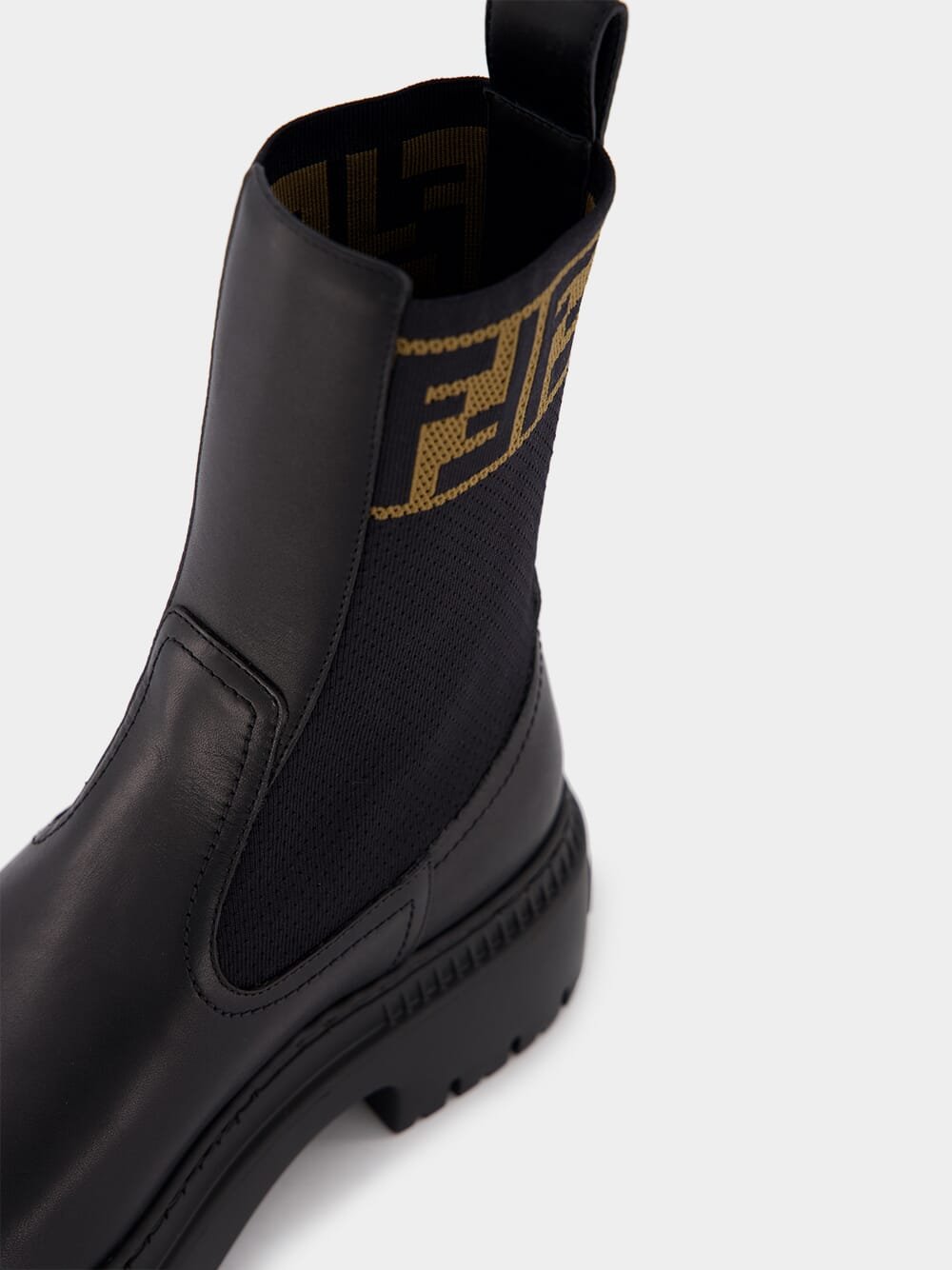 Domino Leather Biker Boots – a perfect blend of rugged charm and contemporary flair. Crafted from sleek black leather, these boots feature elastic inserts for a snug fit and round toes for a classic touch. The robust lug sole in rubber ensures durability and stability on any terrain. Elevate your fashion game with the distinctive FF motif on the instep, making these boots a statement piece for the modern trendsetter.