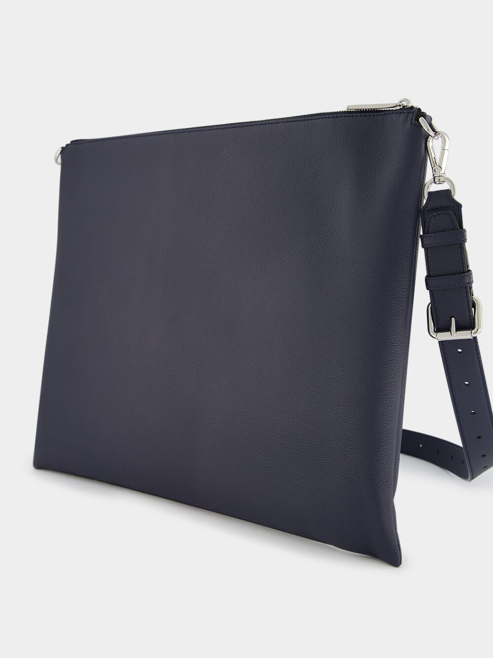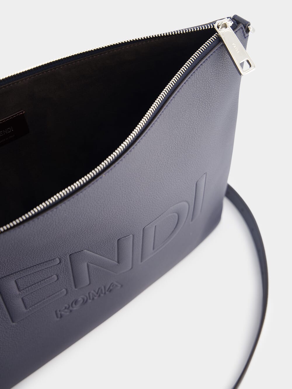 Fendi After Fendi Roma bag, crafted from dark blue full-grain leather, this flat and soft bag showcases a captivating 3D-effect Fendi Roma logo. With a zip fastening, the bag ensures secure storage. The lined interior is paired with palladium-finish metalware for a touch of luxury. The bag offers versatile carrying options - either by hand or cross-body - thanks to the extra-long adjustable, detachable tone-on-tone leather shoulder strap.