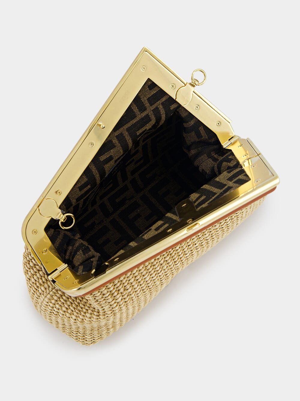 Fendi First Small, crafted with a captivating moss stitch-texture weave and adorned with an oversized metal F clasp bound in luxurious brown nappa leather. The interior compartment, lined in fabric featuring the iconic FF motif, offers stylish organization with pull-out internal attachment points and gold-finish metalware. This versatile bag can be carried by hand as a clutch or worn on the shoulder, thanks to the removable brown leather shoulder strap.