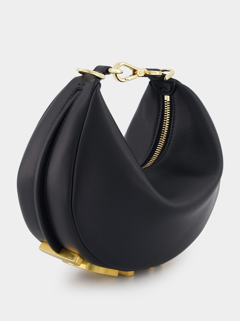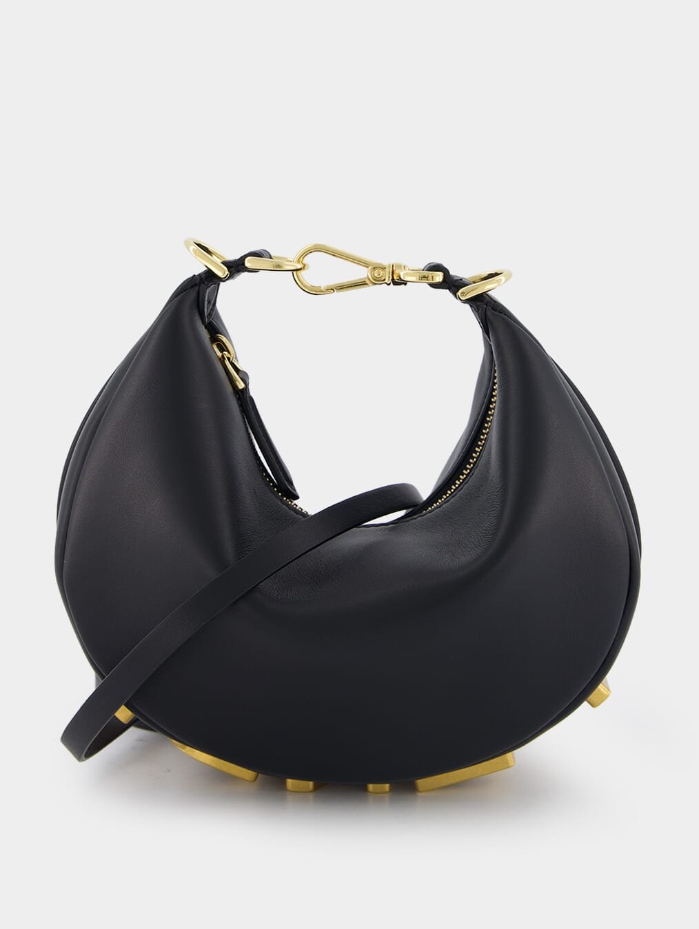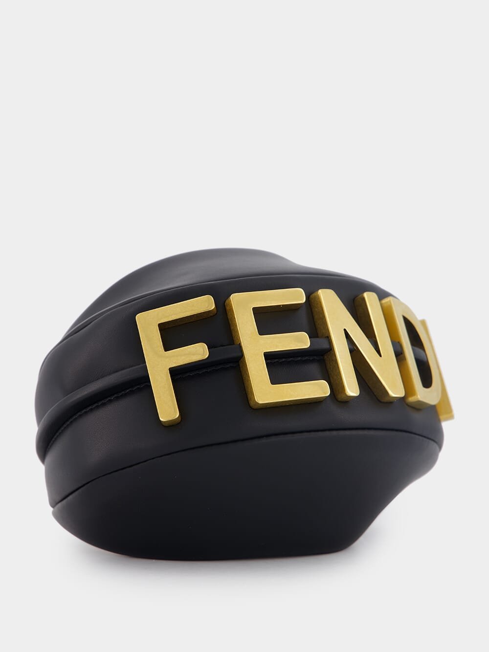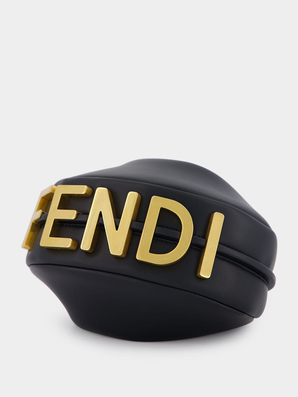 Fendigraphy Mini, crafted from luxurious soft black leather, this mini hobo bag is adorned with vintage gold metal FENDI lettering, adding a touch of timeless elegance. Its zip closure reveals a fabric-lined internal compartment with gold-finish metalware for a polished look. The bag can be carried by hand using the hook and clip as a handle, or worn cross-body with the thin, adjustable, and detachable shoulder strap.