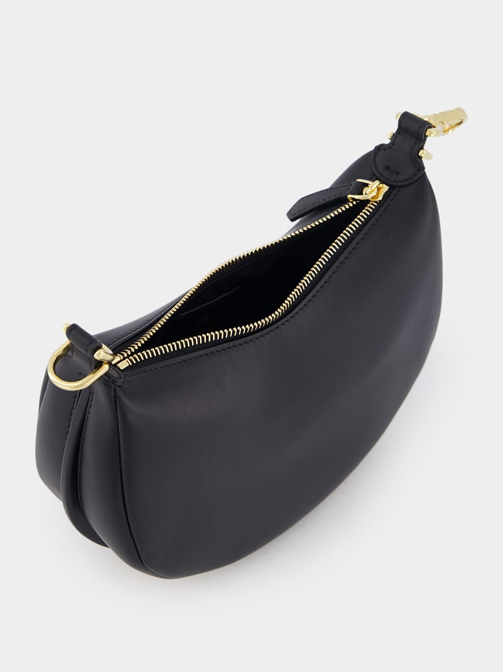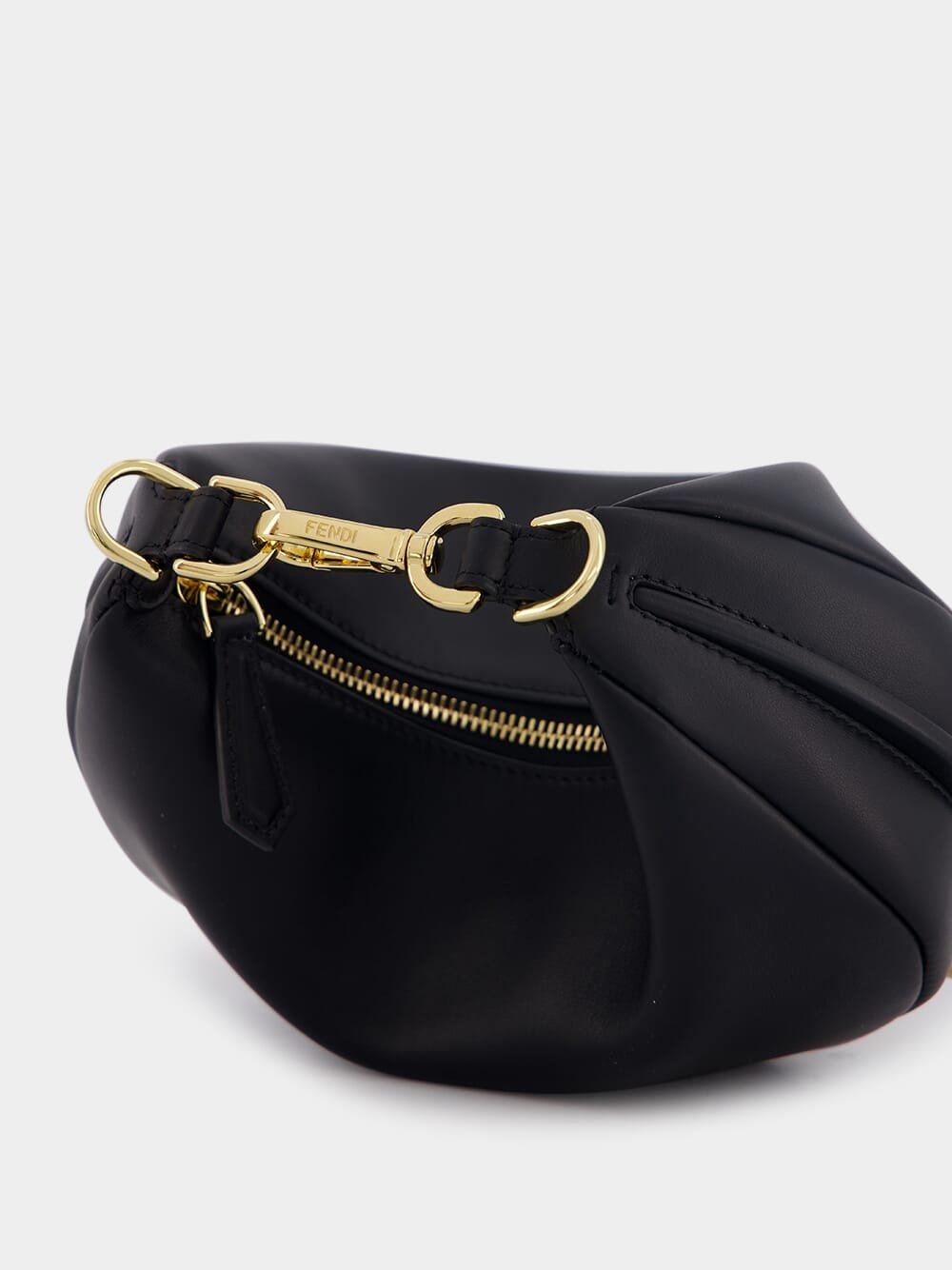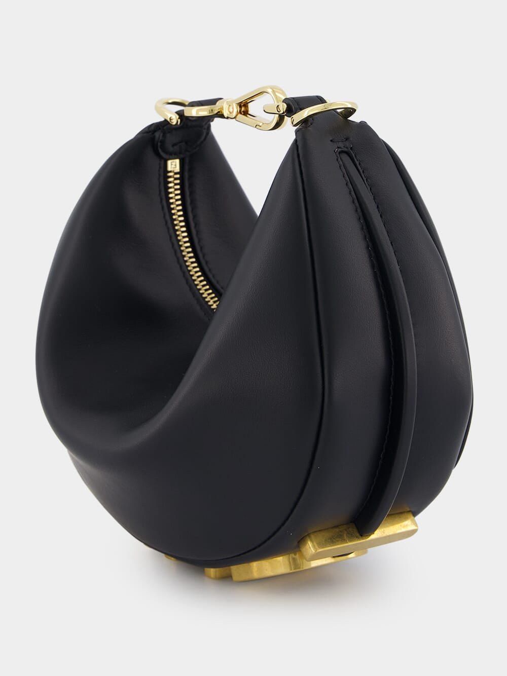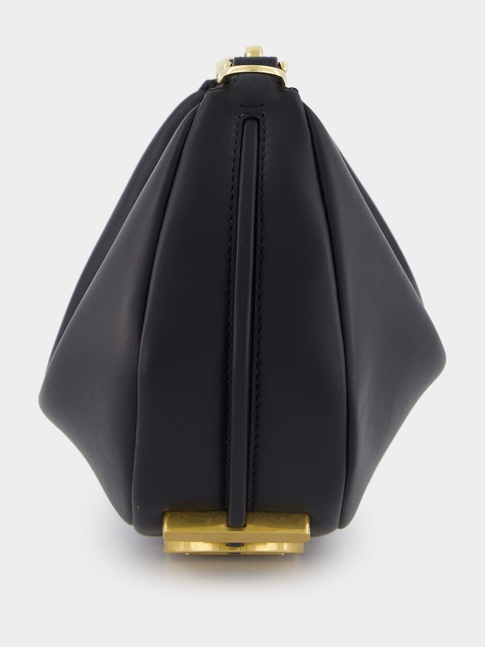 Fendigraphy Mini, crafted from luxurious soft black leather, this mini hobo bag is adorned with vintage gold metal FENDI lettering, adding a touch of timeless elegance. Its zip closure reveals a fabric-lined internal compartment with gold-finish metalware for a polished look. The bag can be carried by hand using the hook and clip as a handle, or worn cross-body with the thin, adjustable, and detachable shoulder strap.