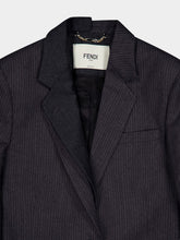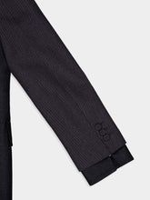 Flannel Single-Breasted Blazer boasts an elongated silhouette, double lapel collar, and set-in sleeves, enhanced by a center-back vent for a modern touch. Featuring a grey pinstriped wool flannel construction, it exudes timeless elegance. The dark grey mélange wool details on cuffs, collar, and sides create a double-layer effect for added flair.