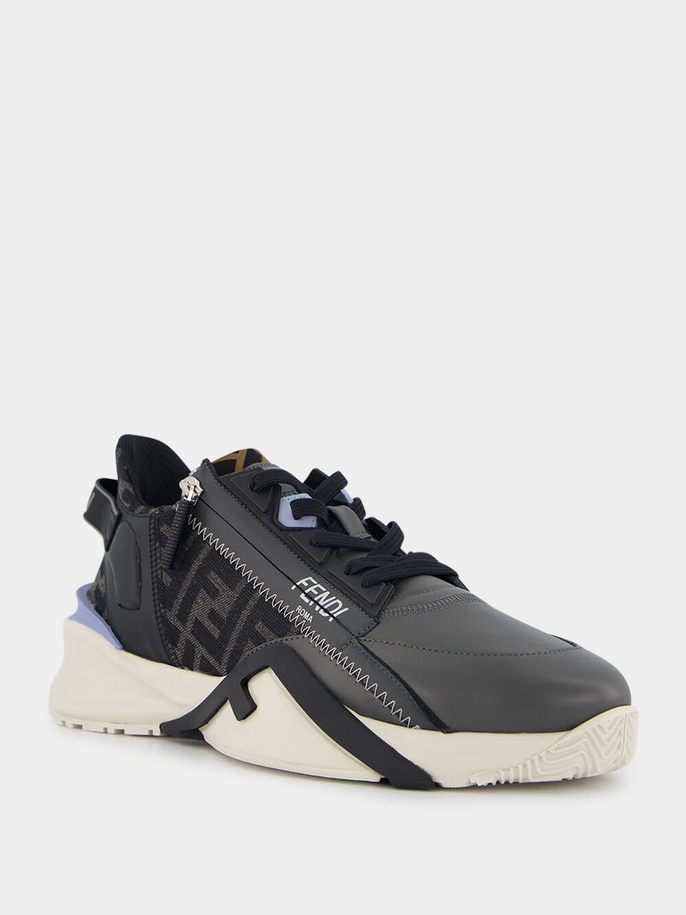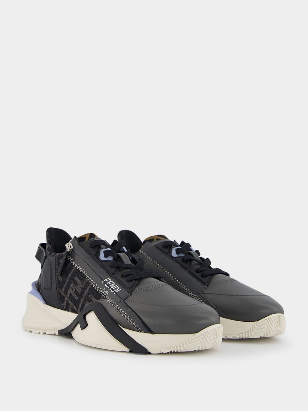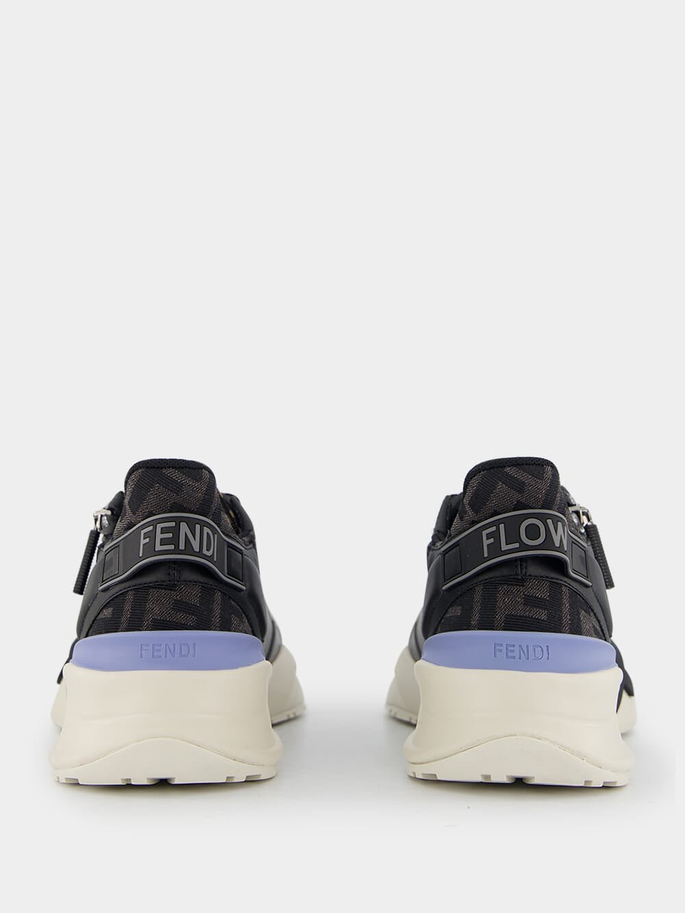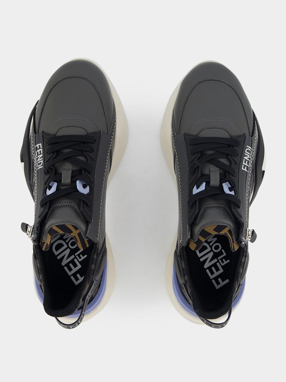 The ultimate slip-on sneakers for modern style, these Fendi Flow grey low-top sneakers feature elasticated laces and a convenient side zip for effortless wear. The signature corrugated sole showcases engraved F lettering, while the dark grey leather boasts FF fabric inserts in black and grey for a bold contrast. Adorned with Lycra® details featuring the iconic FF motif, these sneakers perfectly balance luxury and comfort. Complete with lightweight white rubber soles featuring a distinctive blue diagonal F detail, Fendi Flow Low-Tops redefine casual chic.