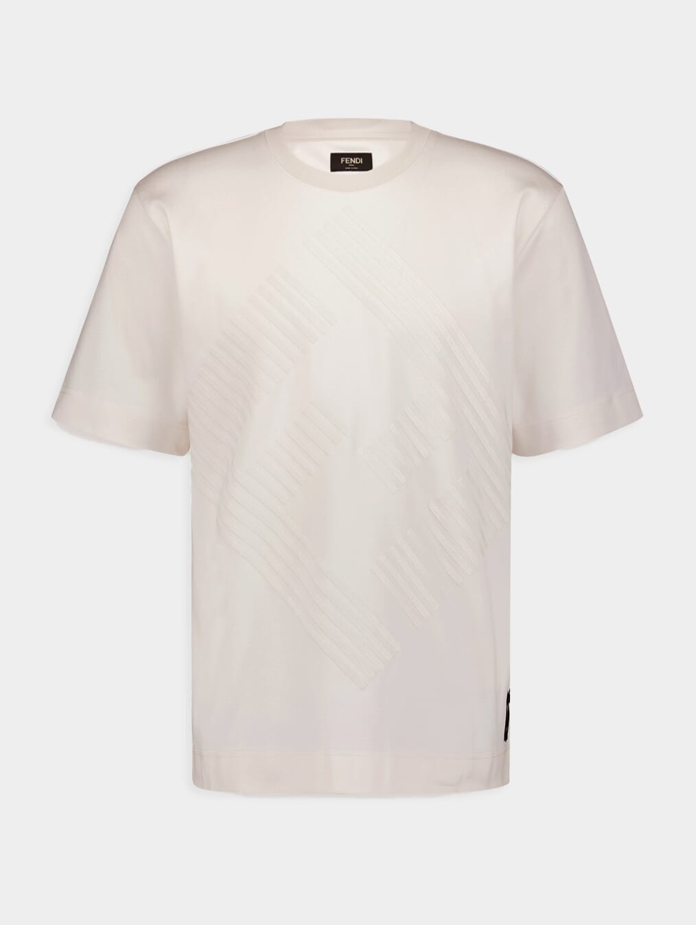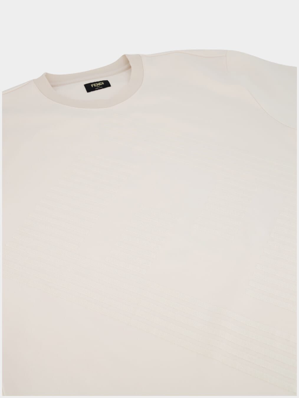 Jersey T-shirt, a short-sleeved crew-neck essential. Crafted from premium white cotton, this oversized T-shirt offers a relaxed fit for everyday wear. Elevating the design, it showcases a custom oversized Fendi Shadow motif embroidered on the front, adding a touch of iconic elegance.