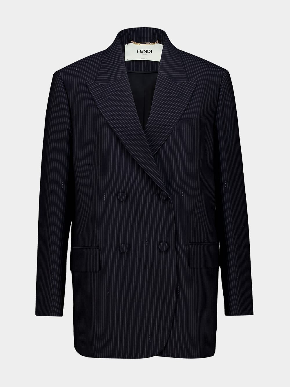 High-waisted trousers featuring a front yoke detail, pleats, and wide, turned-up hems. Designed with side pockets, belt loops, and a matching belt with a metal FF buckle. Crafted from wool with a signature Fendi pinstripe motif and finished with palladium metalware. Concealed zip closure.