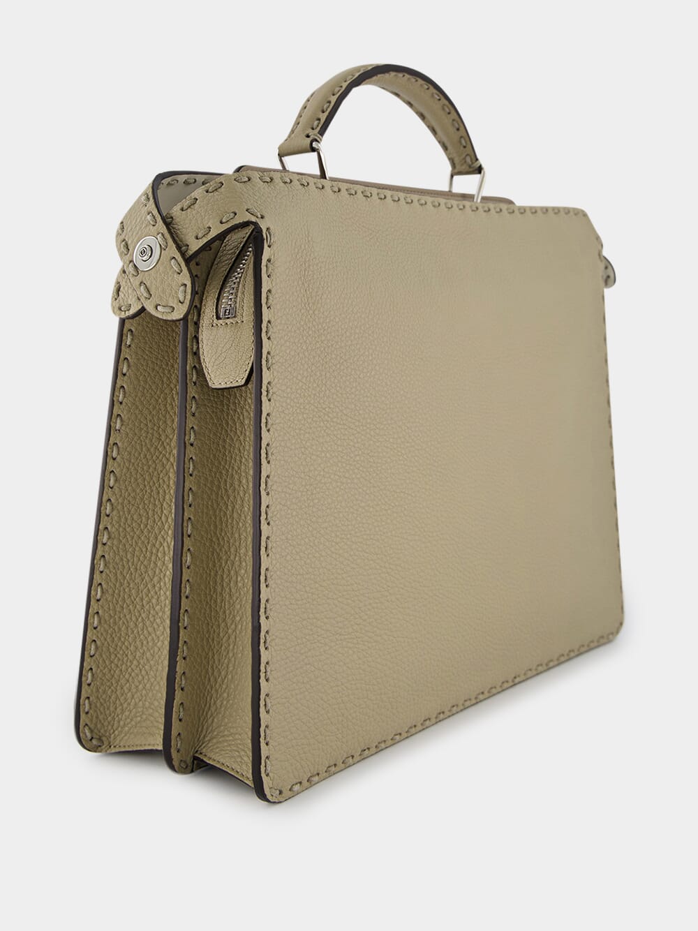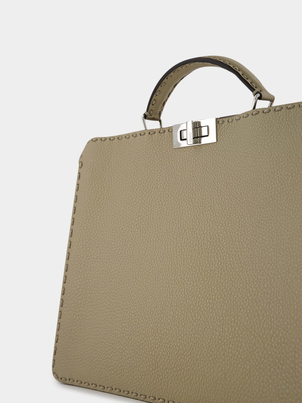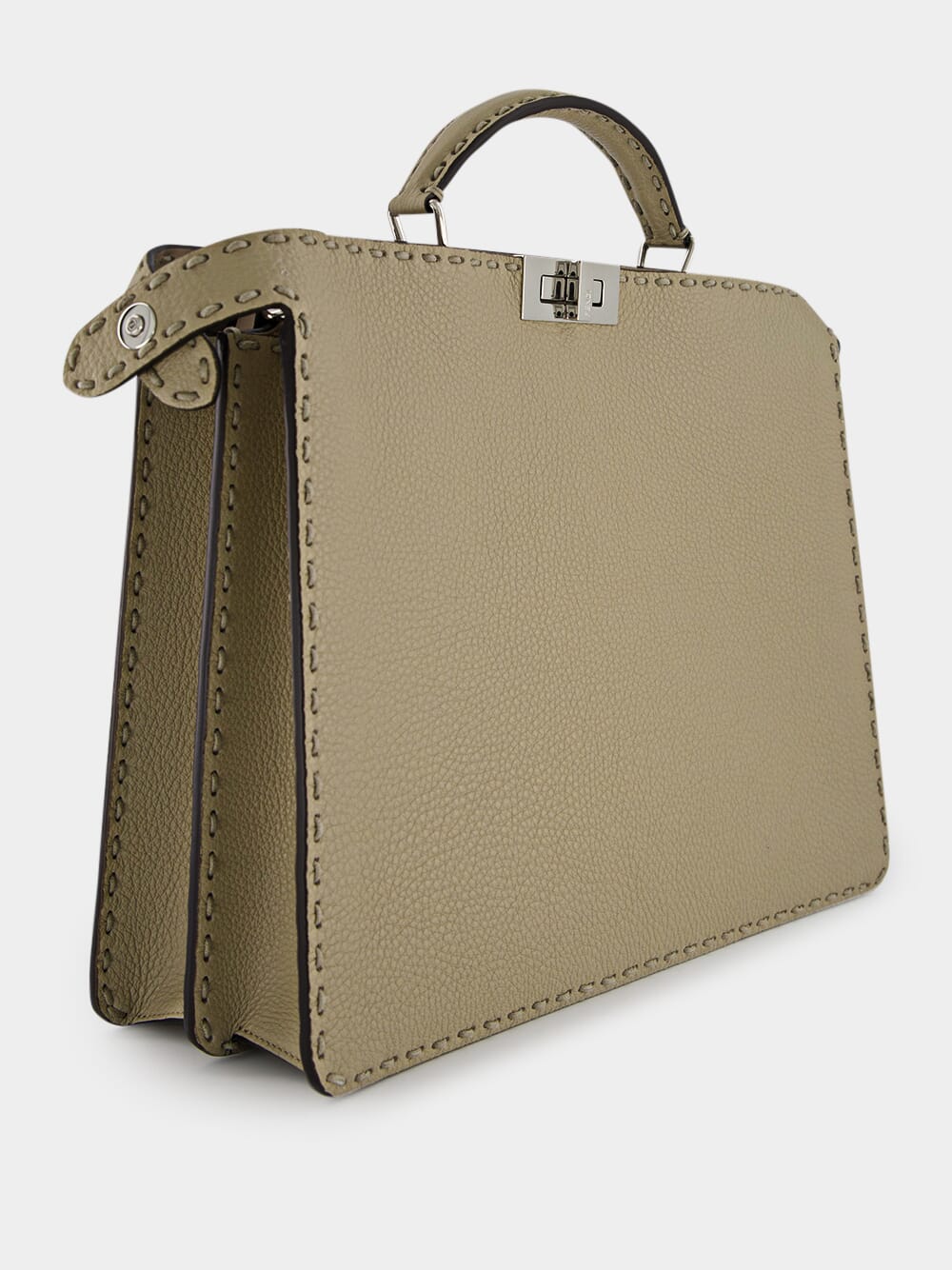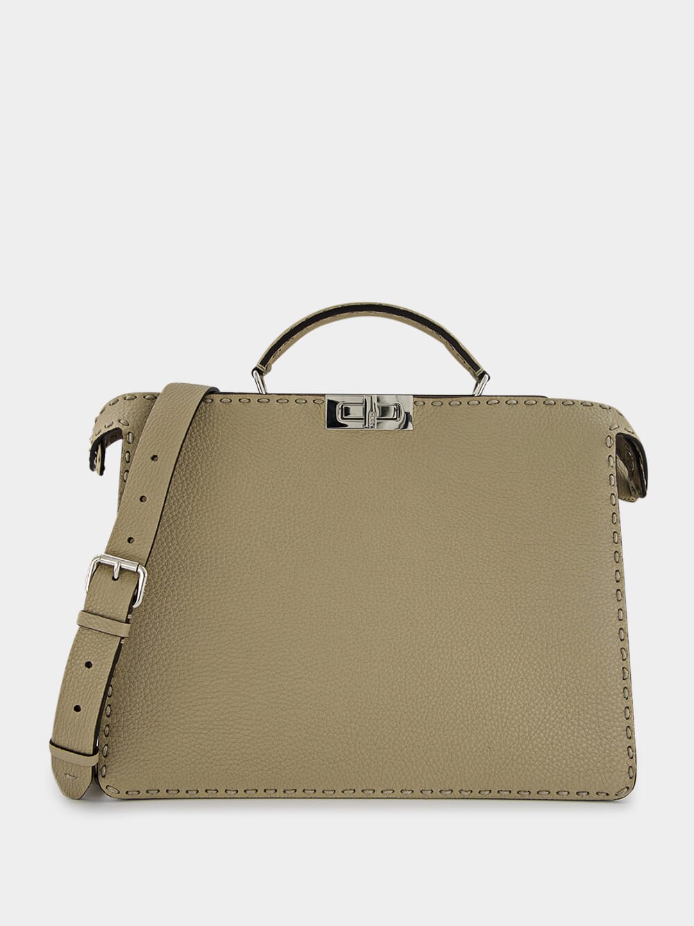 Peekaboo ISeeU Bag, meticulously crafted from light beige Cuoio Romano leather. Designed for the modern trendsetter, this bag boasts exquisite hand-sewn tone-on-tone stitching, showcasing unparalleled attention to detail. This bag features two compartments artfully divided by a stiff partition. The front compartment boasts an iconic twist lock, adding a touch of sophistication to your ensemble. The back compartment offers a convenient zip fastening for secure storage. Included with the bag is a removable interior pocket that epitomizes versatility. Crafted with a combination of light blue leather and FF fabric, this pocket serves as a stunning accessory, offering an elegant contrast to the light beige exterior. Palladium-finish metalware adds a luxurious touch to the overall aesthetic. Whether you prefer the classic hand-held style or the convenience of shoulder wear, this bag accommodates both options effortlessly. The handle provides a firm grip, while the adjustable and detachable shoulder strap offers customizable comfort.