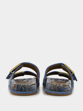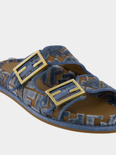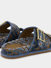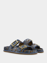 The Blue Fendi Feel slides feature a luxurious double-band design crafted from jacquard velvet with a light blue FF motif. Adorned with iconic FF Baguette decorative buckles and gold-finish hardware, these flat slides blend style and comfort. Made in Italy, they are lined with calf leather for a soft, comfortable feel. Ideal for adding a touch of elegance to any casual ensemble.
