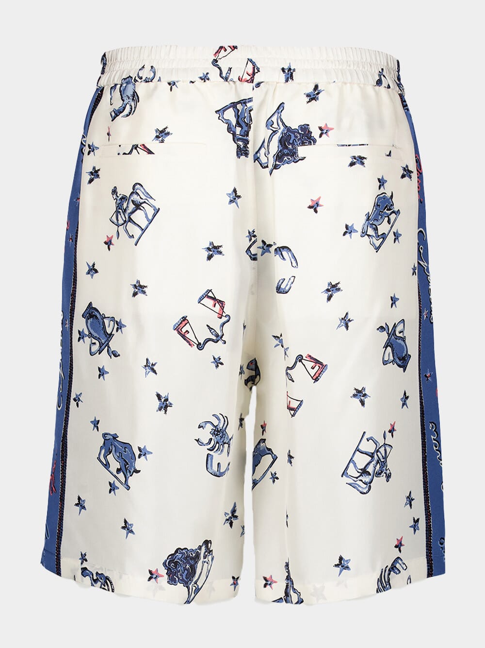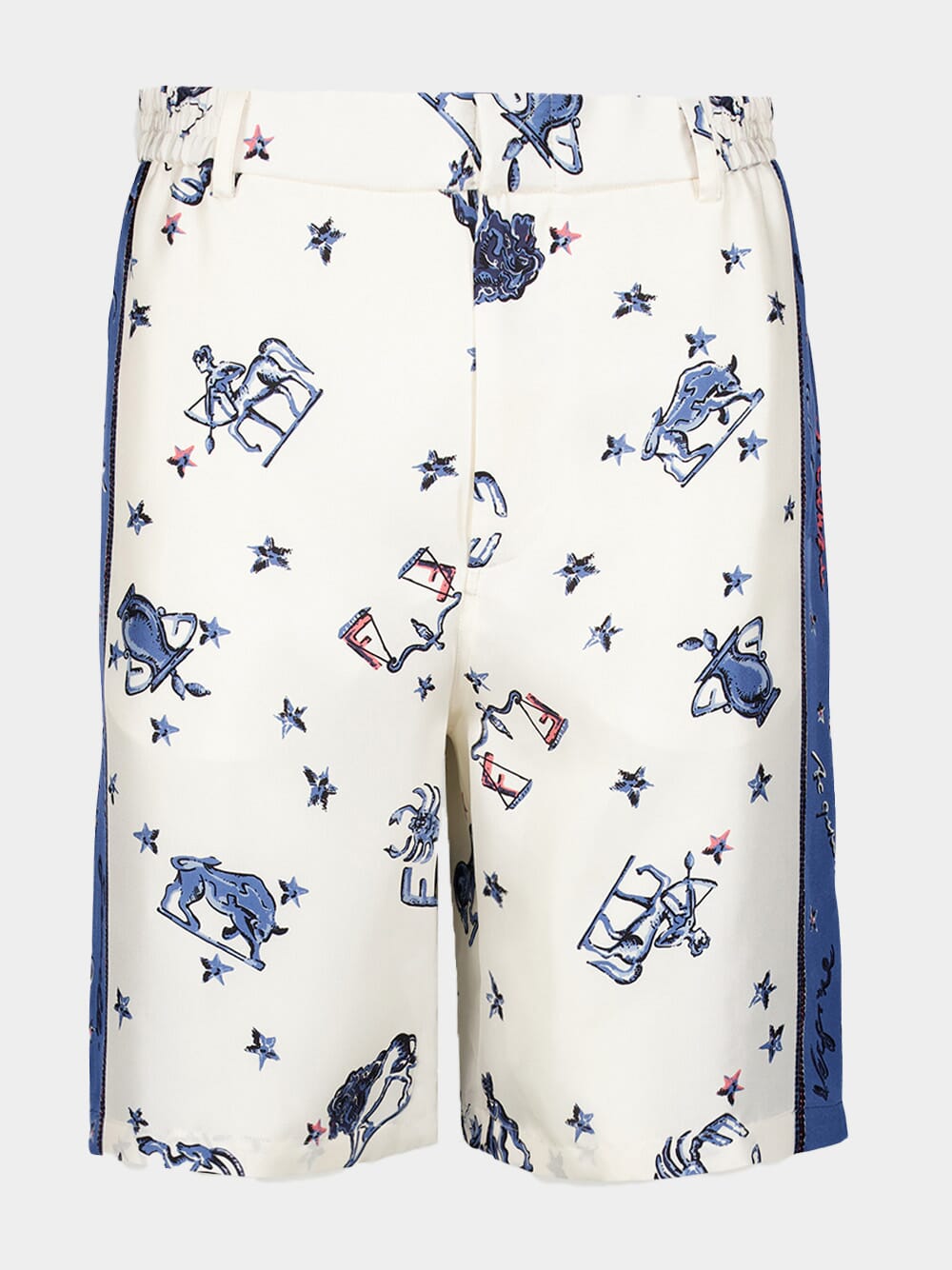 Silk Trousers feature an elastic waist and belt loops for comfort and versatility. Designed with side pockets and patch pockets on the back, these trousers offer both functionality and fashion-forward flair. The concealed zip fastening ensures a seamless look. Crafted from white and orange color block silk, these shorts are adorned with a captivating all-over Fendi Astrology motif print.