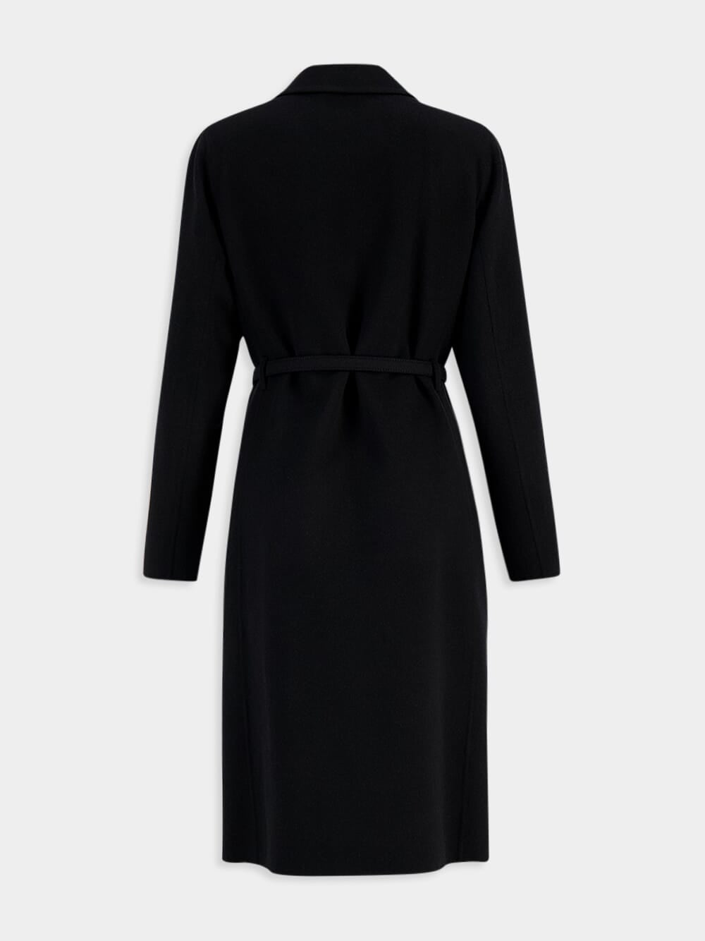 Single-breasted Midi Overcoat, a sophisticated blend of style and comfort. Crafted from premium lightweight double-sided black wool fabric, this midi coat features a rounded shirt collar, set-in sleeves, and slanted pockets for a timeless look. The coat fastens with covered buttons and a thin matching belt at the waist, complete with a metal FF buckle. Inside, the lining is customised with a grey FF motif, adding a touch of luxury to your ensemble.