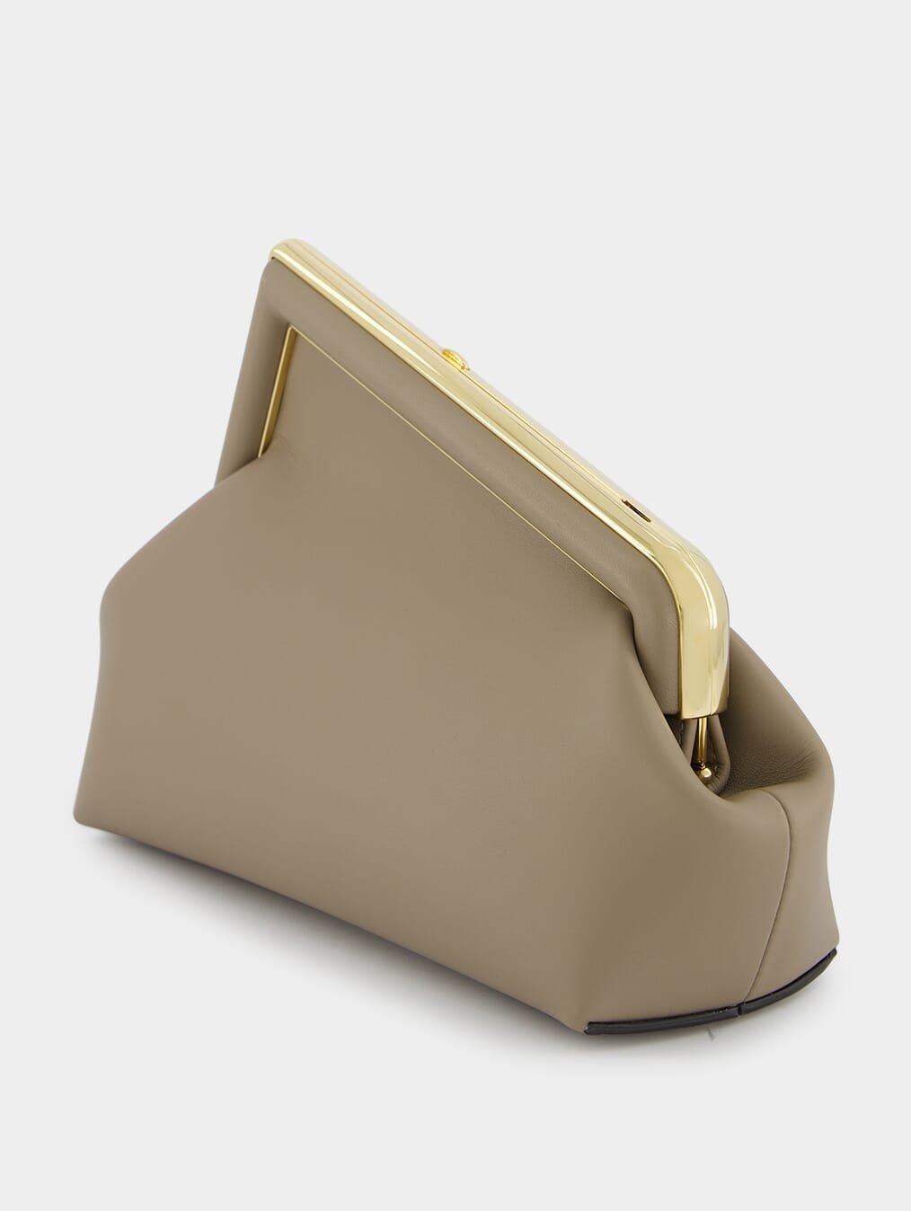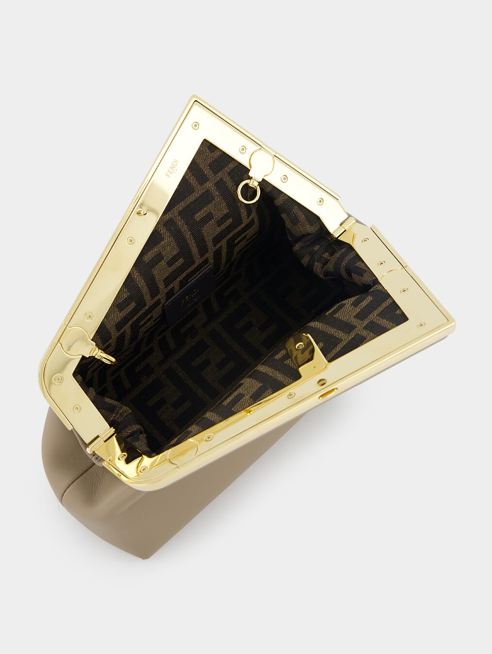 Small Fendi First Bag, crafted from supple dove grey nappa leather, this bag showcases an oversized metal F clasp enveloped in matching nappa leather. Its fabric-lined interior boasts the iconic FF motif, while removable inner hooks and gold-finish metalware add to its allure. This versatile bag offers both a hand-held clutch style and a shoulder-worn option, thanks to the detachable shoulder strap.