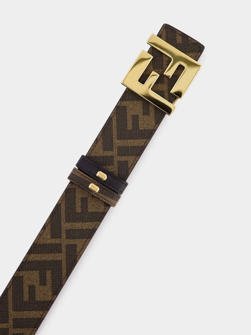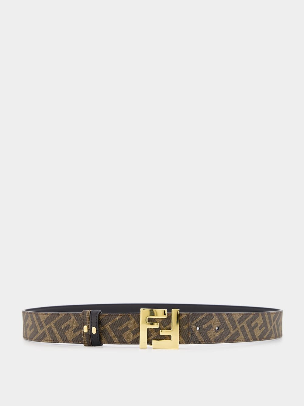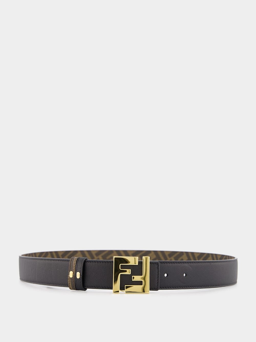 Squared Leather Reversible Belt, a versatile accessory that seamlessly blends style and functionality. Elevate your look with the iconic FF stud buckle, showcasing a bold design. Crafted from premium black leather, this belt offers a luxurious touch to your ensemble. The reversible feature provides flexibility, while the fabric lining boasts a sophisticated black and grey FF motif.