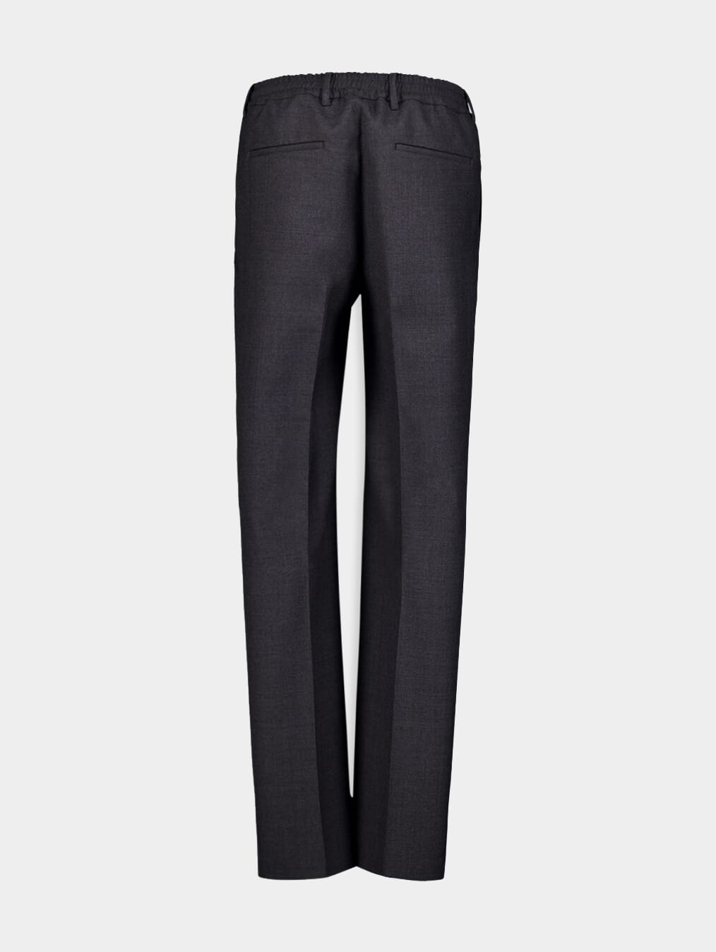 Virgin Wool Tailored Trousers, crafted from luxurious virgin wool for exceptional quality and comfort. These trousers feature belt loops, a concealed front zip fastening, and two side welt pockets for convenience. The elasticated waist inserts ensure a personalized fit, while the silver-tone logo plaque adds a touch of sophistication. With pleat detailing and two rear welt pockets, these trousers offer a timeless straight leg silhouette that effortlessly combines style and professionalism.
