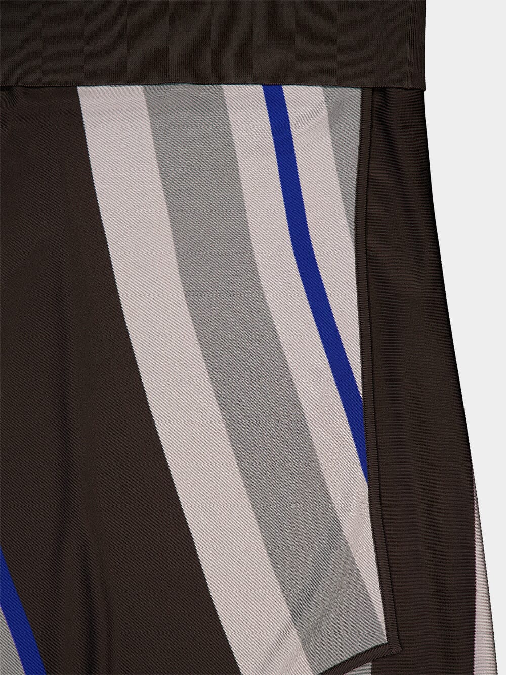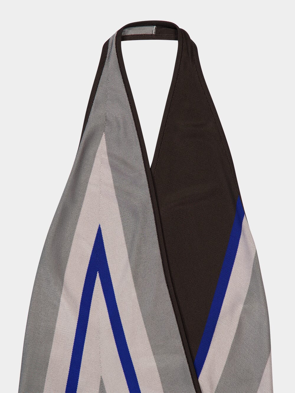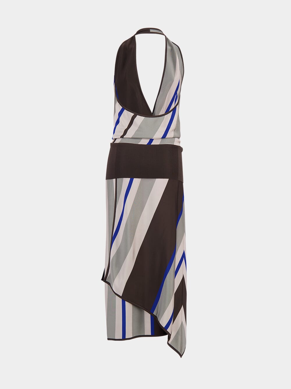 This halter neck, ankle-length dress is crafted from soft, stretchy jersey viscose, responsibly sourced. The bold pattern features a mix of seasonal hues arranged diagonally for a striking effect. The dress combines feminine sensuality with comfort, featuring a low-cut back, ribbed waist, and a wrap front design.