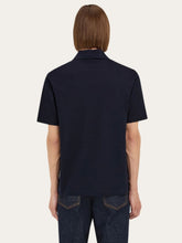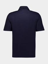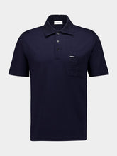 This navy blue V-neck polo from Ferragamo is a sophisticated choice for smart-casual looks. Crafted in Italy from premium cotton piqué jersey, it features a refined jacquard monogram on the collar and a matching tonal chest pocket for added texture. The button-up collar and custom metal tab above the pocket provide an elegant finish, making it an ideal piece for elevated everyday styling.