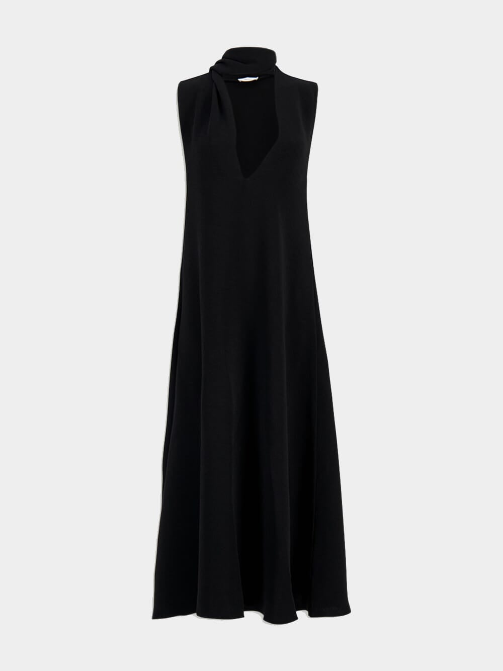Draped-Detail Maxi Dress, a true masterpiece of elegance and style. This dress features stunning draped detailing, adding a touch of sophistication to your look. The plunging V-neck and sleeveless design exude modern allure. Embrace both comfort and fashion with the slight flare, complemented by an asymmetric hem for a unique and flattering silhouette. With an ankle-length design, this dress is the epitome of timeless chic.
