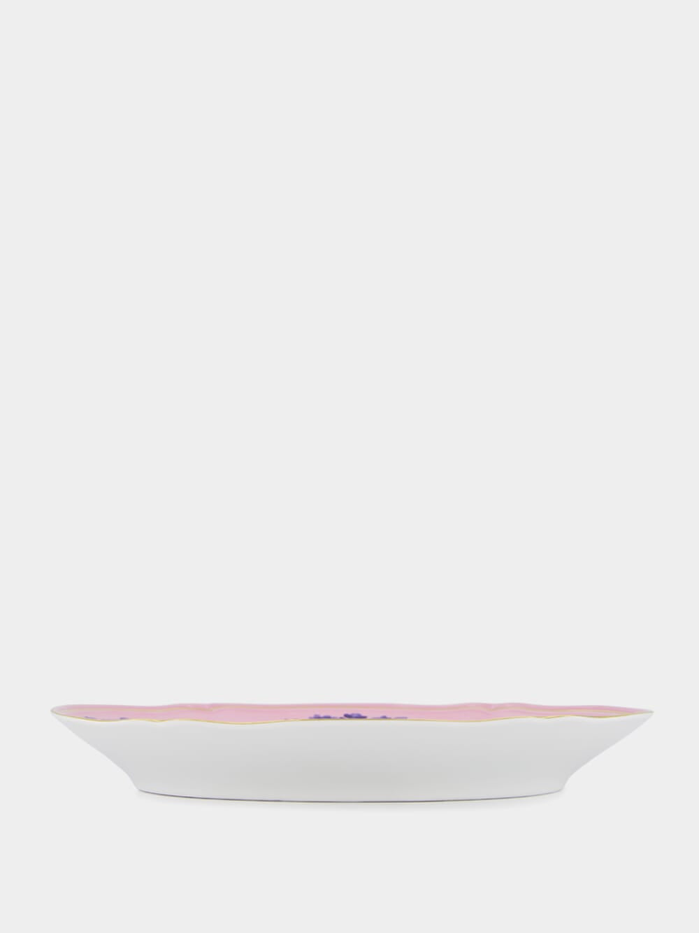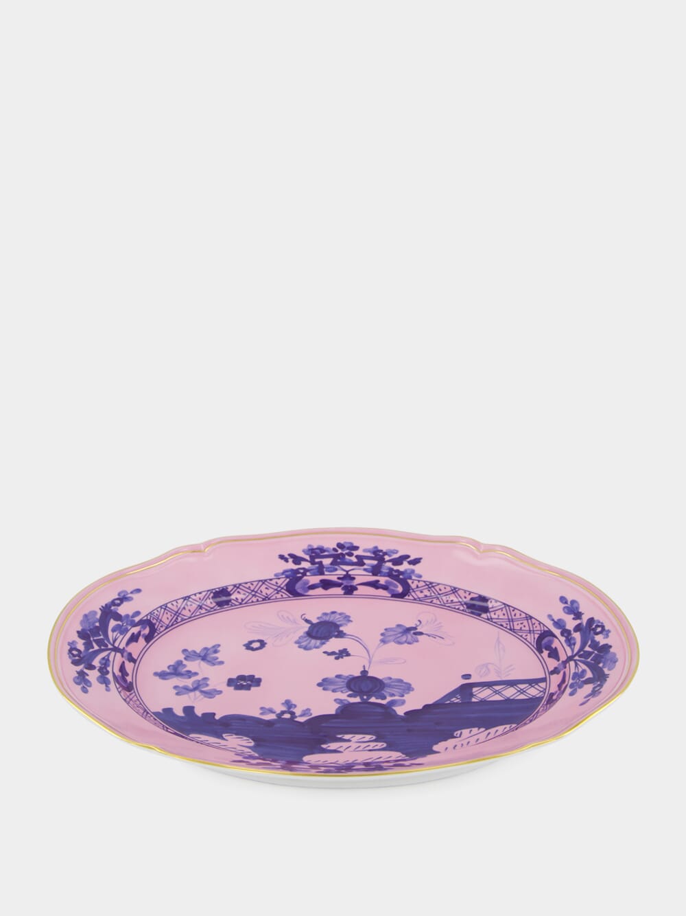 Revel in the grandeur of Italian design with the Oriente Italiano Azalea large oval platter. This iconic piece features the signature blue carnation motif against a stunning azalea pink porcelain, a blend of tradition and opulence. Hand-painted gold threading outlines the classic contours of the Antico Doccia shape, making it a statement piece that elevates any gastronomic journey.