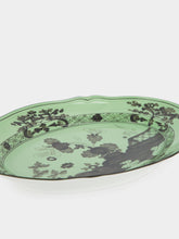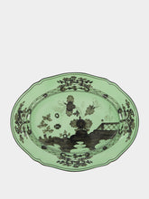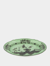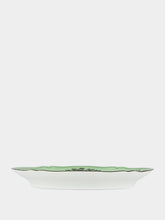 The Bario Oval Platter, part of the Oriente Italiano collection, exudes a serene elegance with its barium green palette. The celebrated Garofano carnation motif, prominent in Ginori 1735's collections, offers a striking contrast on this fine porcelain piece shaped in the classic Antico Doccia. Available in multiple hues, including versions with gold threading, this platter commands attention as the table's centerpiece and complements the brand's porcelain range, infusing the setting with oriental charm and Florentine artisanal heritage.