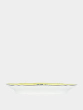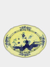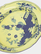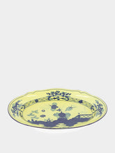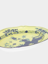 A sophisticated oval platter from the Oriente Italiano collection, this piece presents a delicate blue carnation motif on citrine yellow porcelain. Its contours are defined by distinctive blue threading along the Antico Doccia shape, offering a timeless elegance. Perfect for those seeking to add a unique charm to their table settings with a touch of color and tradition.