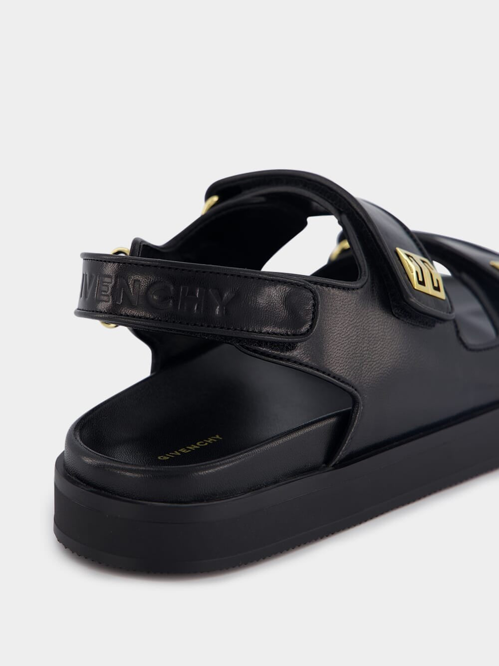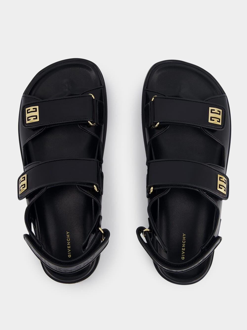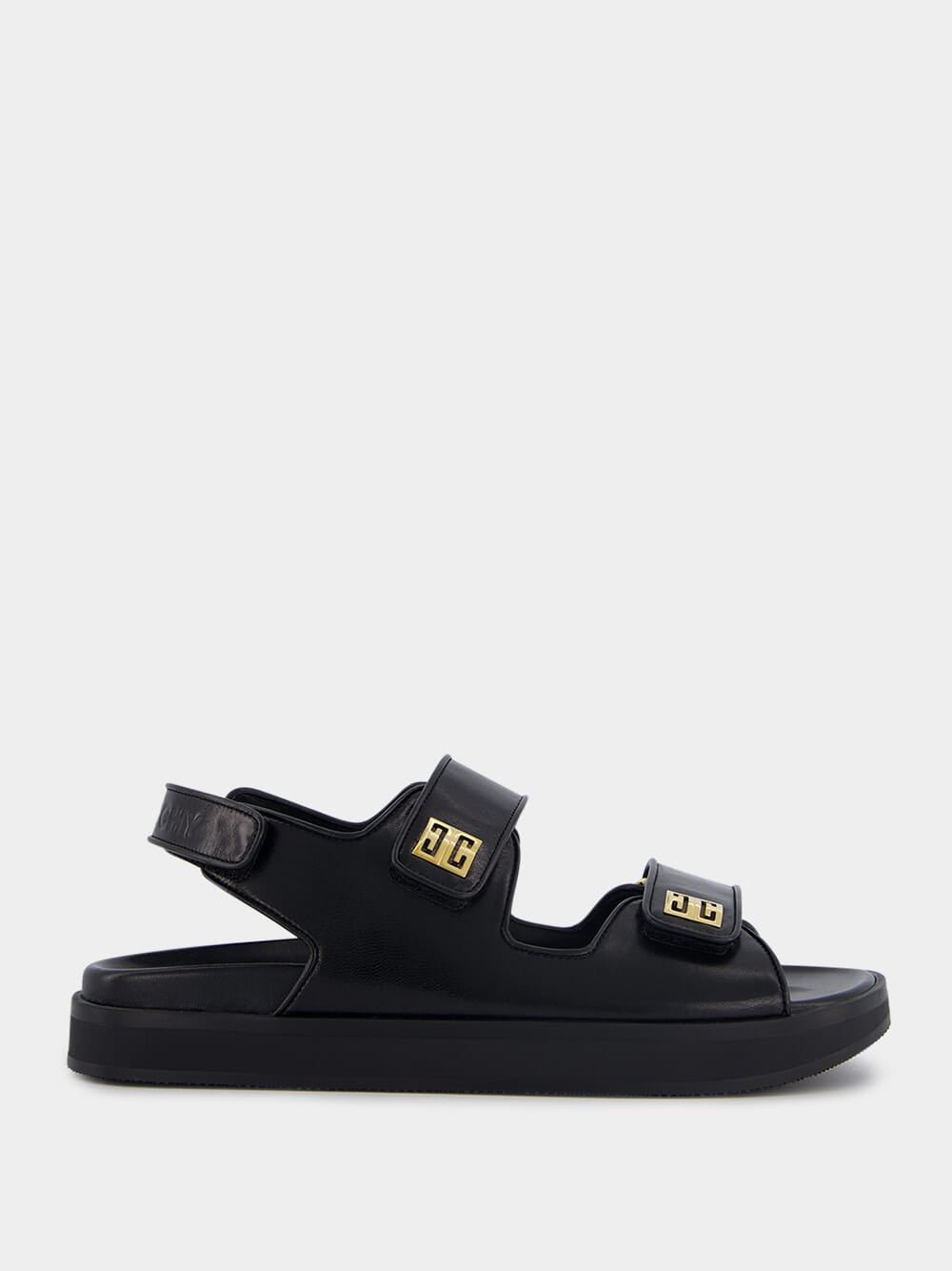 4G Sandals In Leather, crafted with premium leather straps showcasing the iconic 4G line. These sandals feature adjustable scratch straps with a golden-finish metal 4G piece on the upper bands, adding a touch of elegance. The leather insole bears the golden GIVENCHY signature, signifying the brand's commitment to quality and style. The GIVENCHY signature is also embossed on the back for added flair.