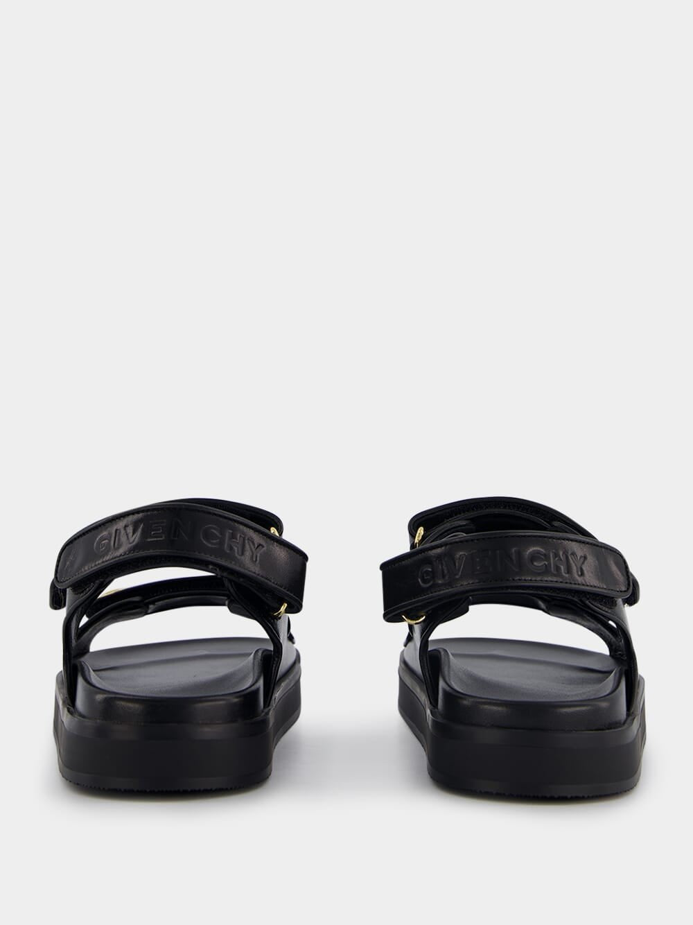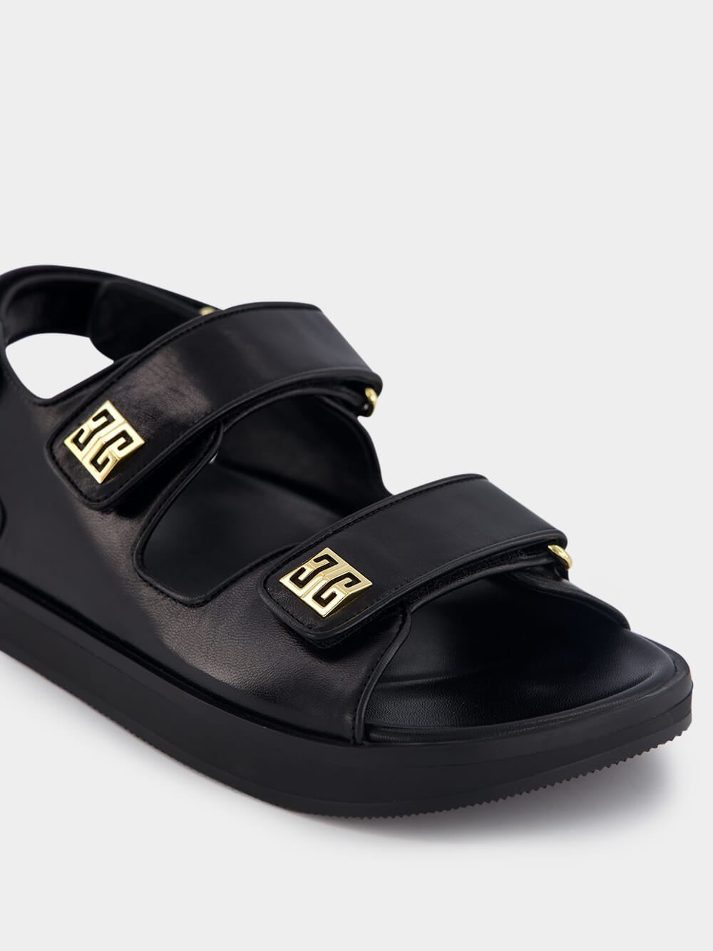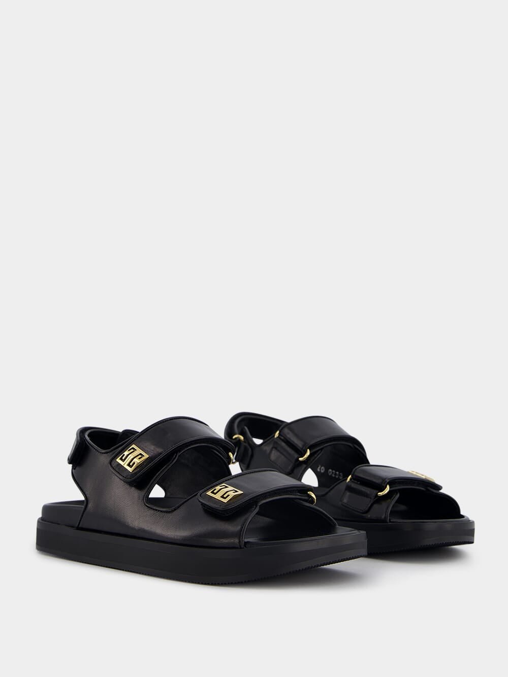 4G Sandals In Leather, crafted with premium leather straps showcasing the iconic 4G line. These sandals feature adjustable scratch straps with a golden-finish metal 4G piece on the upper bands, adding a touch of elegance. The leather insole bears the golden GIVENCHY signature, signifying the brand's commitment to quality and style. The GIVENCHY signature is also embossed on the back for added flair.
