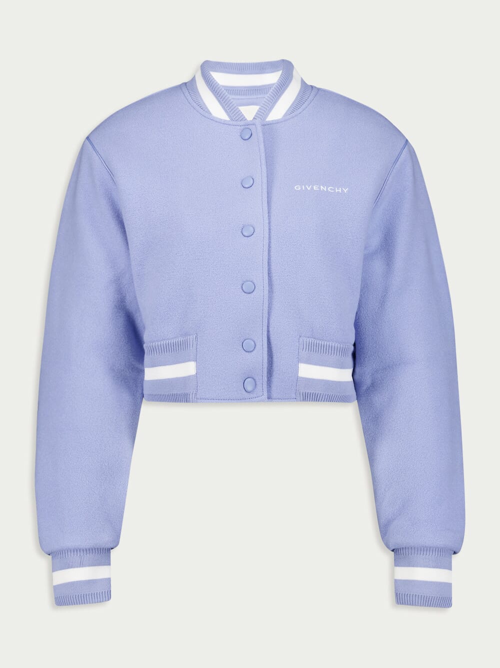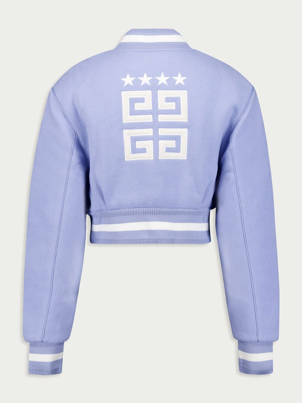 4G Stars Cropped Varsity Jacket, crafted from premium wool, offering both warmth and style. Adorned with small contrasting GIVENCHY signature embroidered patches on the front and eye-catching 4G Stars embroidered patches on the back, it exudes a modern and chic look. The ribbed elasticated knit collar, cuffs, and hem with contrasting stripes add a sporty touch. With a tone-on-tone snap closure and a flattering cropped fit, this jacket is the epitome of fashion-forward elegance.