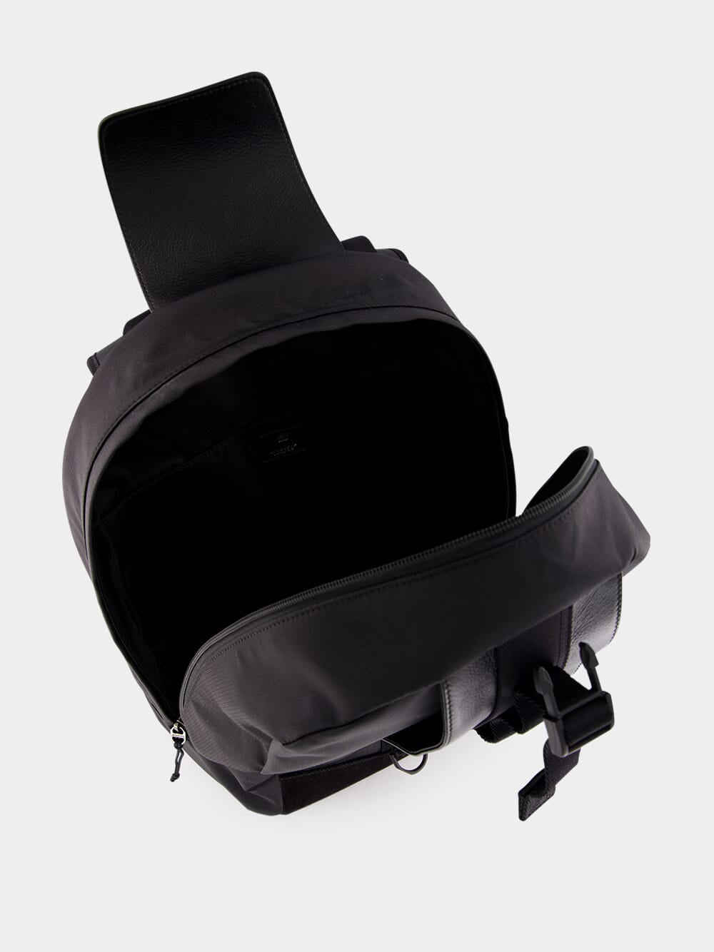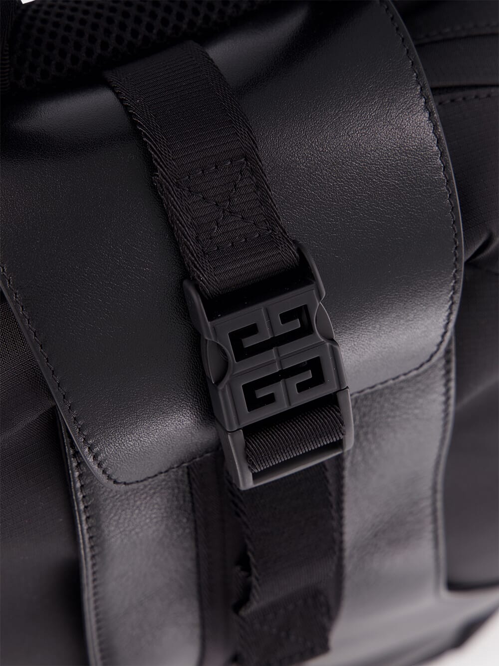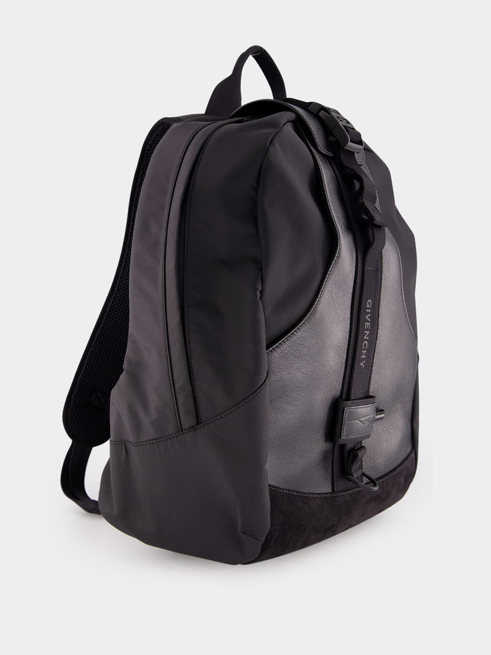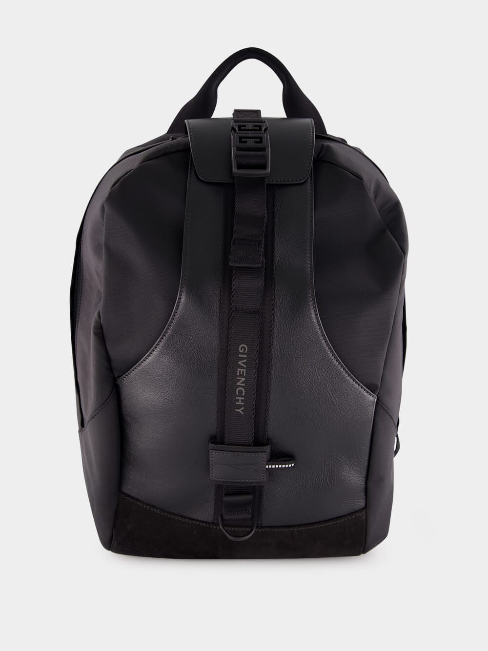 The Medium G-Trail Backpack in nylon and textured leather combines functionality and luxury. Part of the G-Trail line, it features a zip closure, two padded Givenchy webbing straps, and a padded back for ultimate comfort. The front boasts a GIVENCHY webbing strap with a 4G buckle clip closure, a decorative scratch with Giv Cut signature, and a metal D-ring. Inside, it has a main compartment with a padded flat pocket for a computer, along with a flat front pocket and two side bottle compartments. Black-finish metal details add a sleek touch.