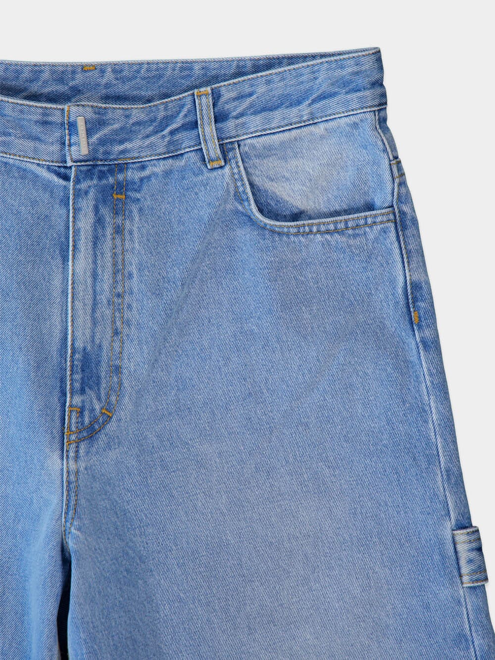 Carpenter Bermuda Shorts in Light Washed Denim, crafted with precision, these shorts feature a waist with loops and a zipped closure with a metal bar GIVENCHY, adding a touch of luxury to your outfit. Embrace the convenience of two front pockets, along with carpenter pockets featuring buckles for a unique and trendy look. The shorts also boast two double pockets and one hidden pocket on the back, providing ample storage space. Complete with 4G metal rivets on the back, these Bermuda shorts exude contemporary charm and elegance.