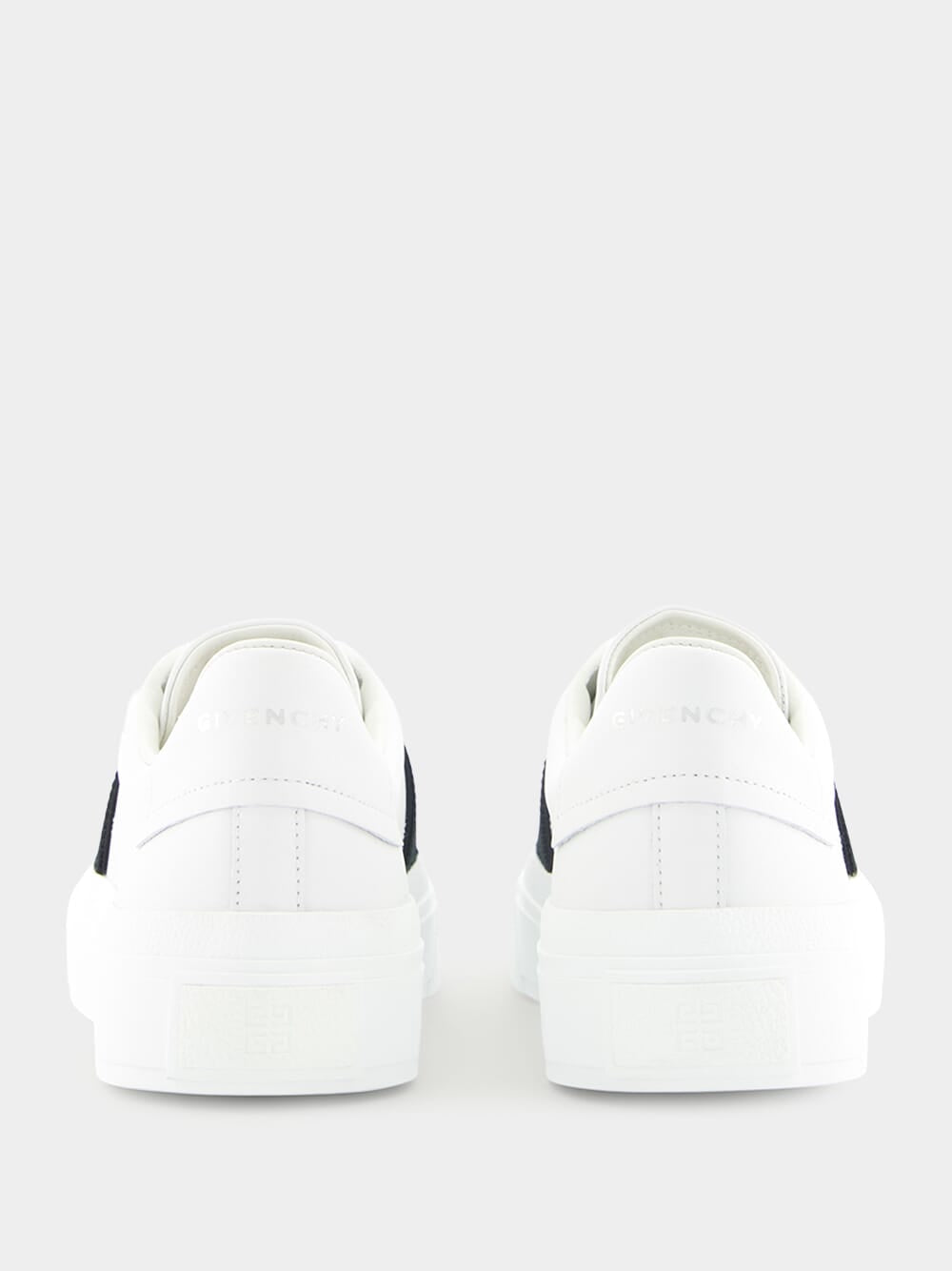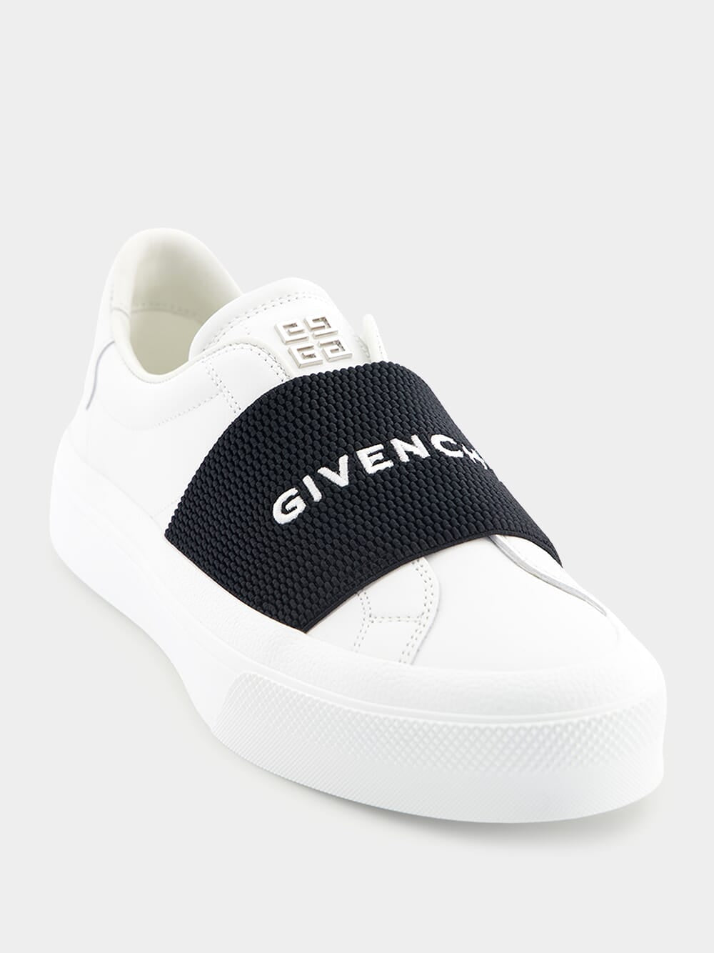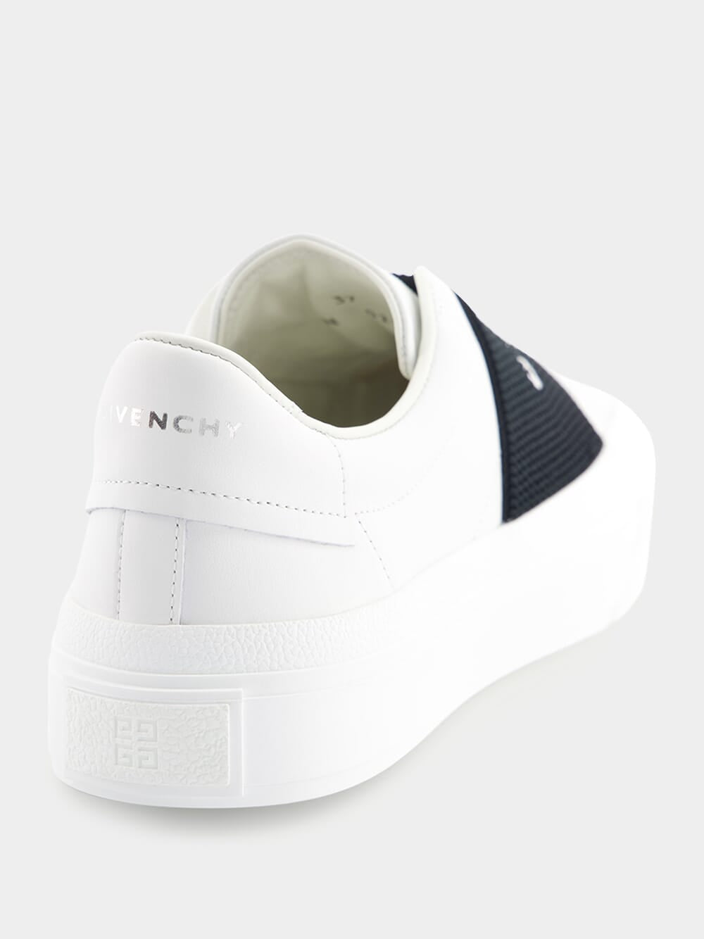 Givenchy City Sport leather sneakers featuring silver GIVENCHY signature on the back and 4G emblem engraved on the heel.