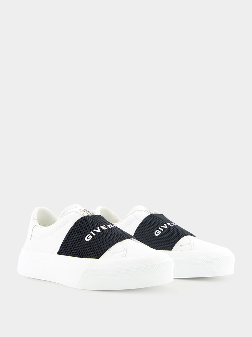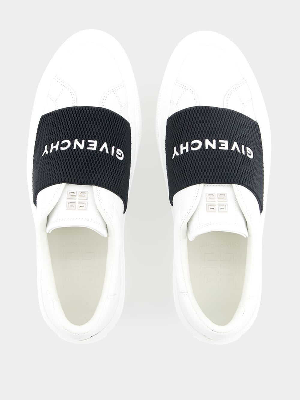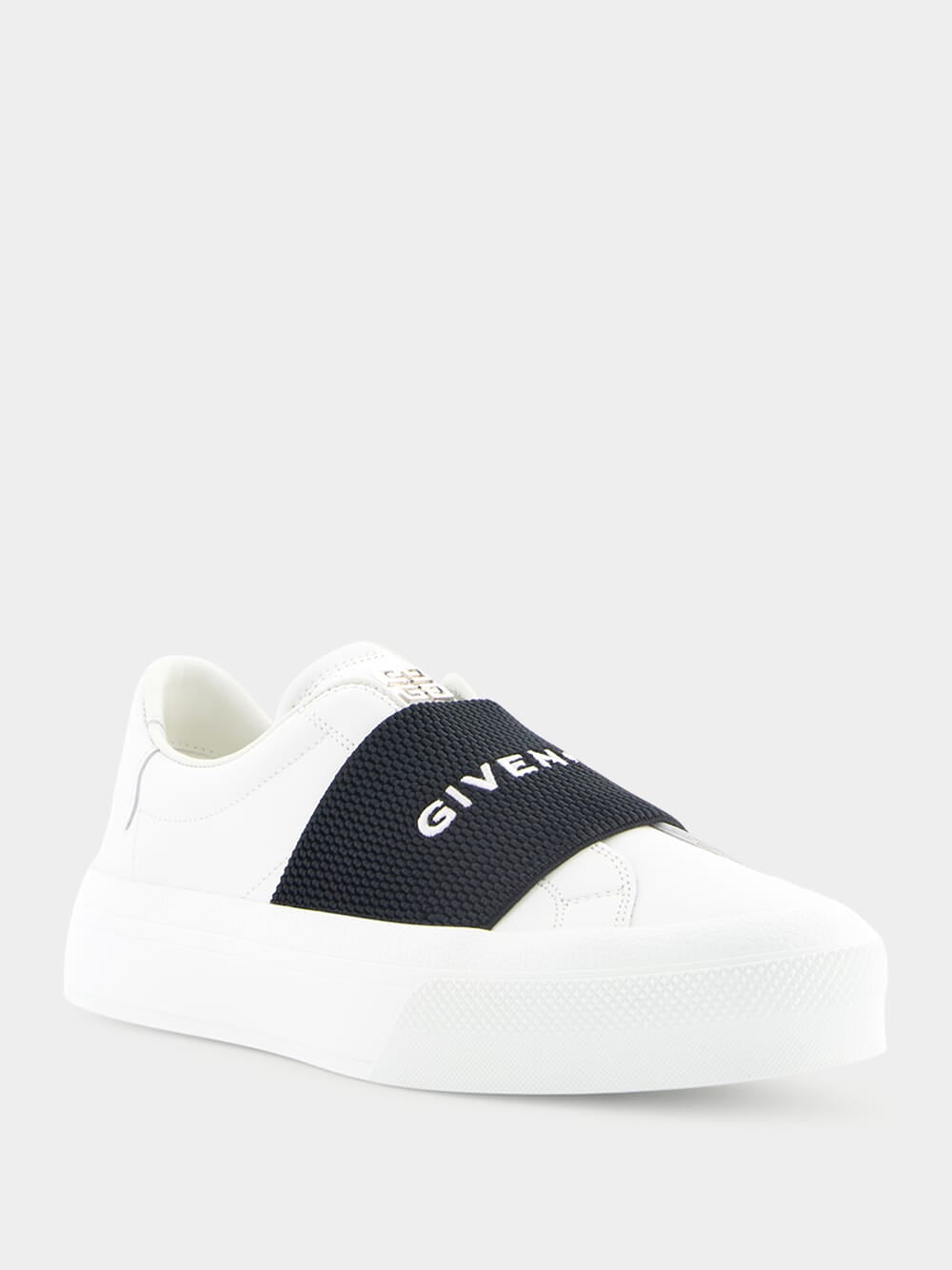 Givenchy City Sport leather sneakers featuring silver GIVENCHY signature on the back and 4G emblem engraved on the heel.
