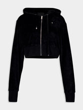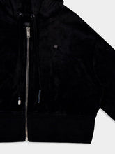 This black cropped sweatshirt by Givenchy features a luxurious velvet look, combining casual comfort with high-end style. The sweatshirt is designed with a drawstring hood, a front zip closure, and long sleeves, while the cropped cut adds a contemporary edge. The subtle Givenchy logo lettering enhances the refined aesthetic, making this piece perfect for elevating your casual wardrobe with a touch of elegance and modernity.