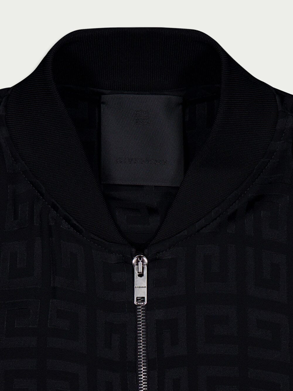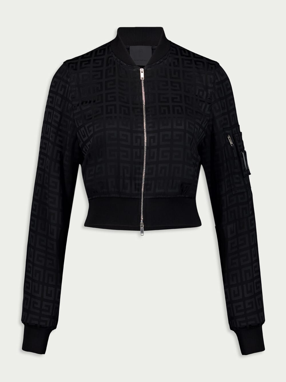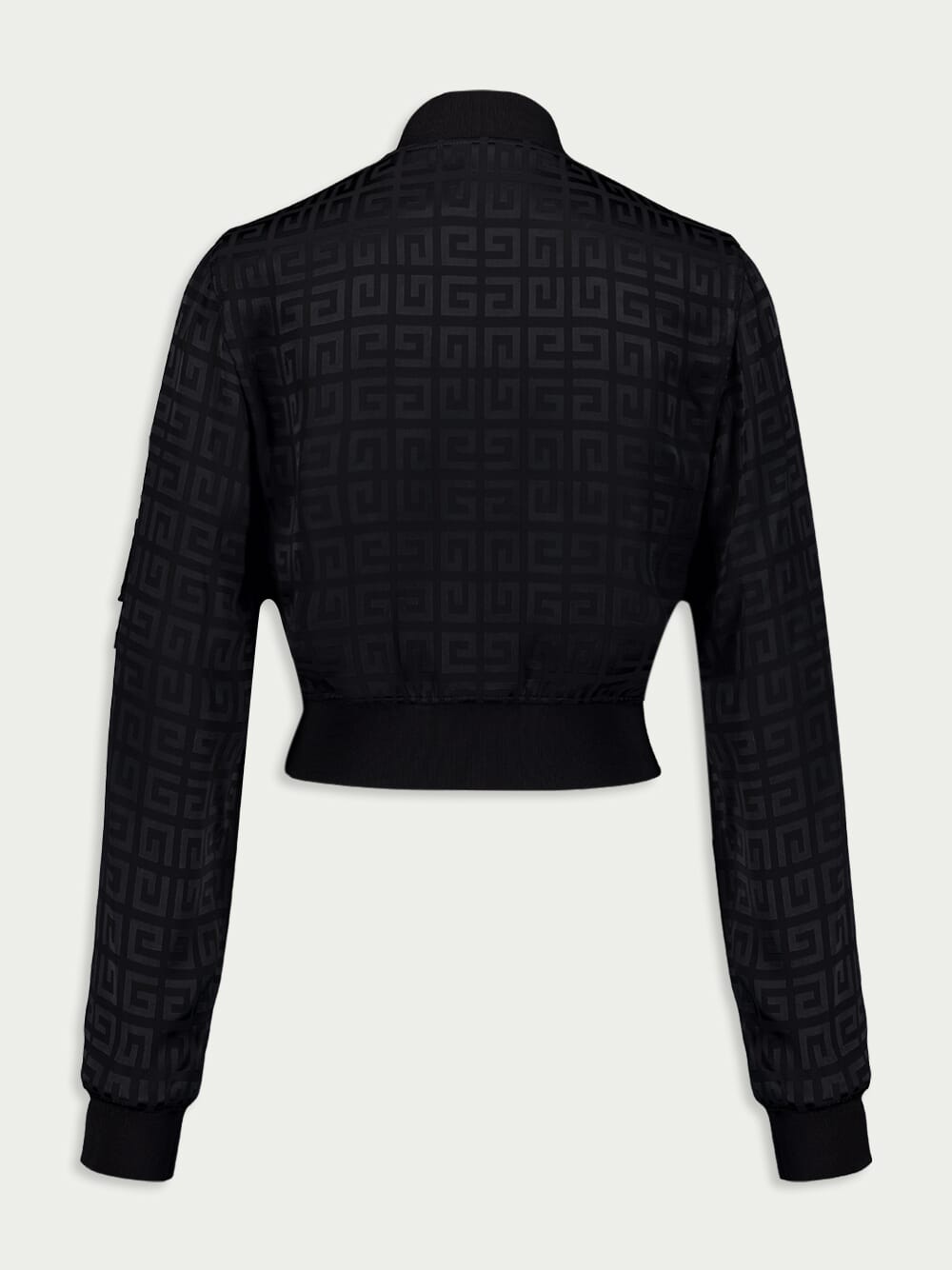 Cropped Bomber Jacket in 4G Jacquard, crafted from viscose jacquard, this bomber jacket features the iconic 4G pattern all-over, showcasing impeccable craftsmanship. It offers functionality with one zipped pocket and one small pocket on the left sleeve, adorned with GIVENCHY engraved metal clips. The metal zipped closure adds a touch of sophistication. The collar, hem, and cuffs in tone-on-tone knit create a seamless and stylish finish. Embrace a flattering cropped fit, elevating your look effortlessly.