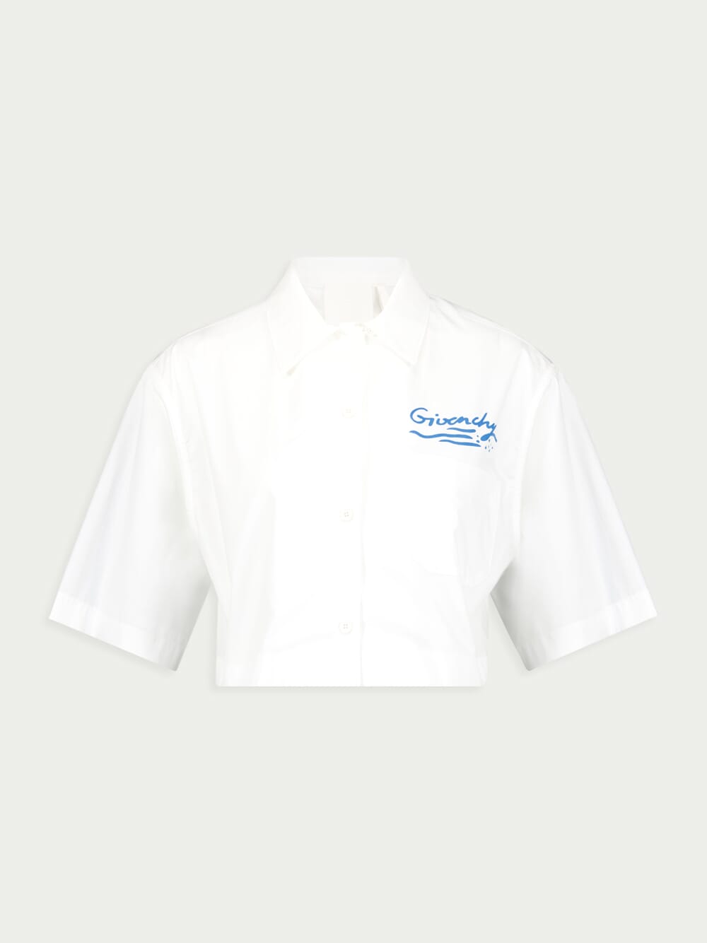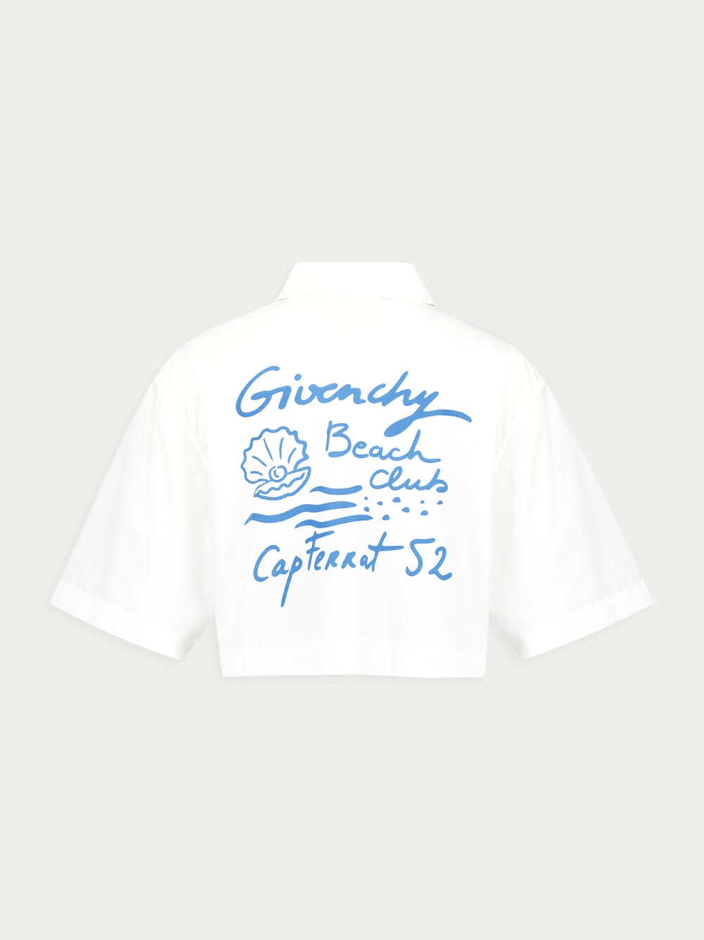 Cropped Shirt in Cotton, the epitome of summer style. This short-sleeved shirt is crafted from soft cotton, offering both comfort and fashion. The standout feature is the GIVENCHY Beach Club 52 print on the front and back, showcasing a modern and trendy design. With a classic Hawaiian collar and one flat pocket on the front, it exudes a laid-back and sophisticated vibe. The button closure adds a touch of elegance, completing the look.