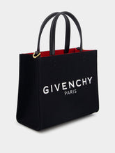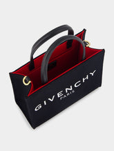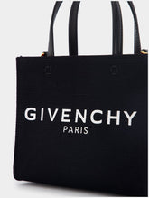 Mini Canvas G-Tote Shopping Bag, a versatile and chic addition to your accessories collection. This mini tote bag is expertly crafted from a blend of cotton canvas and linen, designed to be carried by hand or worn on the shoulder or crossbody, thanks to the removable GIVENCHY webbing shoulder strap with calfskin leather details and metal ring. The contrasting GIVENCHY Paris signature on the front adds a touch of sophistication, while leather handles and golden-finish metal details elevate the bag's aesthetic. Inside, you'll find a convenient flat pocket, all complemented by contrasting canvas lining.