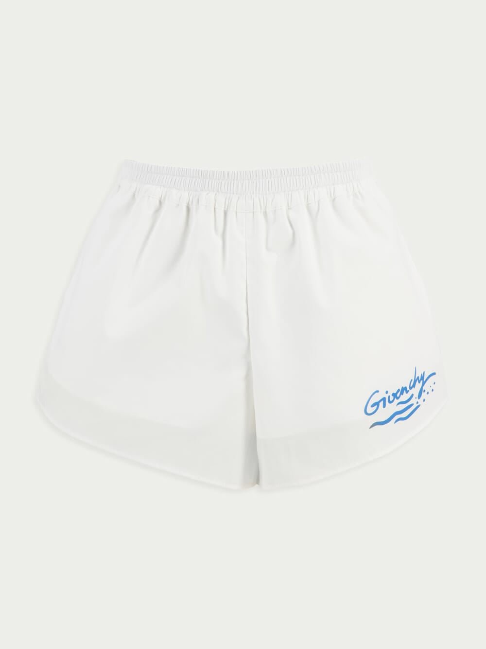 Mini Shorts in Cotton, crafted from soft cotton, these shorts offer both style and comfort. The standout feature is the GIVENCHY Beach Club 52 print on the front, adding a touch of chic elegance. The elastic waist ensures a comfortable and adjustable fit. With two side pockets, these shorts offer added functionality.