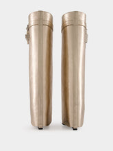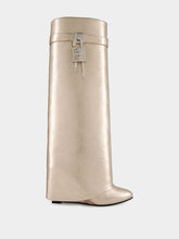 These striking Shark Lock boots in a dusty golden hue feature laminated calfskin leather for a luxurious, modern look. With a unique slip-on design, they are adorned with the iconic GIVENCHY silvery-finish 4G padlock and metal clasp, enhancing their bold aesthetic. The almond toe and covered wedge heel add sophistication and comfort, with a 3.5-inch heel height for an elevated silhouette. Handcrafted in Italy, these boots embody elegance and craftsmanship, perfect for making a statement in any upscale ensemble.
