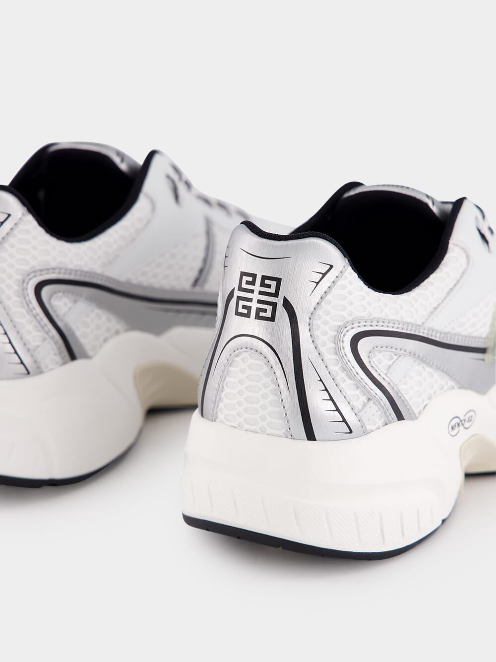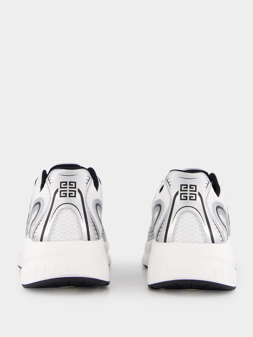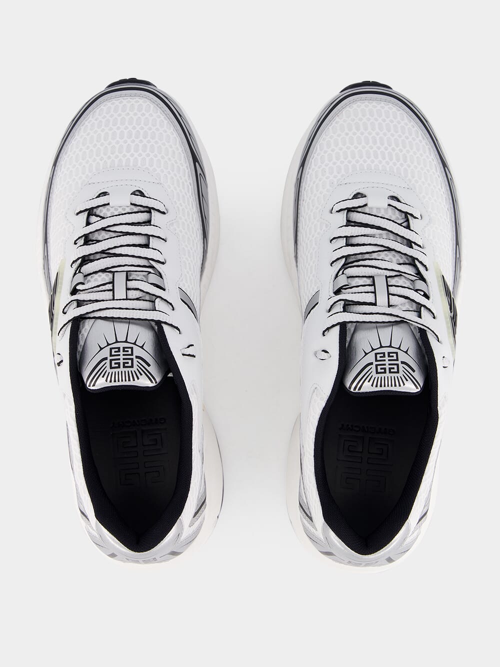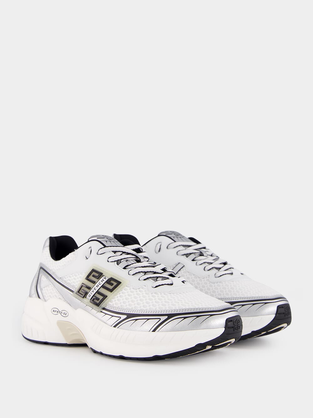 These innovatively designed NFNTY-52 runners combine synthetic leather and mesh for a modern, sporty look. Featuring a raised 4G emblem with a GIVENCHY ribbon on the side, printed 4G emblems on the tongue and back, and an emblem on the front of the sole, these sneakers make a bold statement. The NFNTY-52 signature is printed on the side of the sole, and an infinity symbol is found under the foot. With a light, resistant, and recyclable pebax sole, these runners offer durability and eco-friendly appeal. Perfect for athletic or casual wear, they ensure comfort and style.