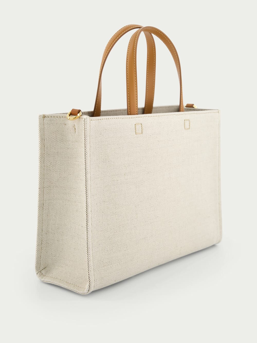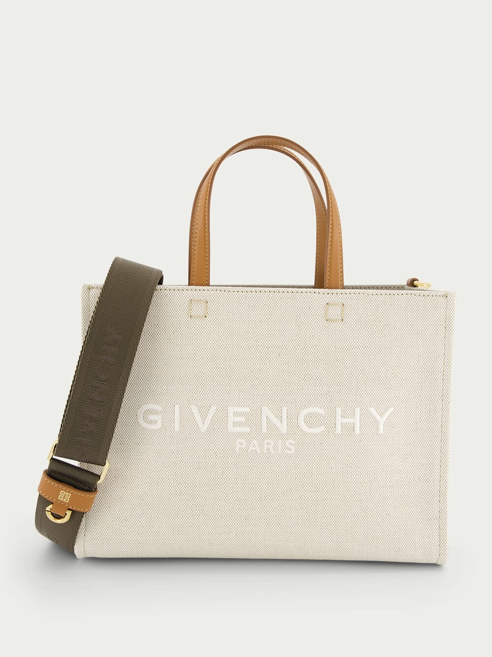 GIVENCHY Small G-Tote Canvas Bag crafted in cotton canvas. Part of the G-Tote line, this bag can be effortlessly worn on the shoulder or carried by hand, making it ideal for any occasion. The white GIVENCHY PARIS signature is delicately embroidered on the front, adding a touch of elegance. The bag features a removable webbing GIVENCHY shoulder strap with leather details, as well as leather handles for easy carrying. With golden-finish metal details and a convenient flat pocket inside, this bag is a must-have accessory.