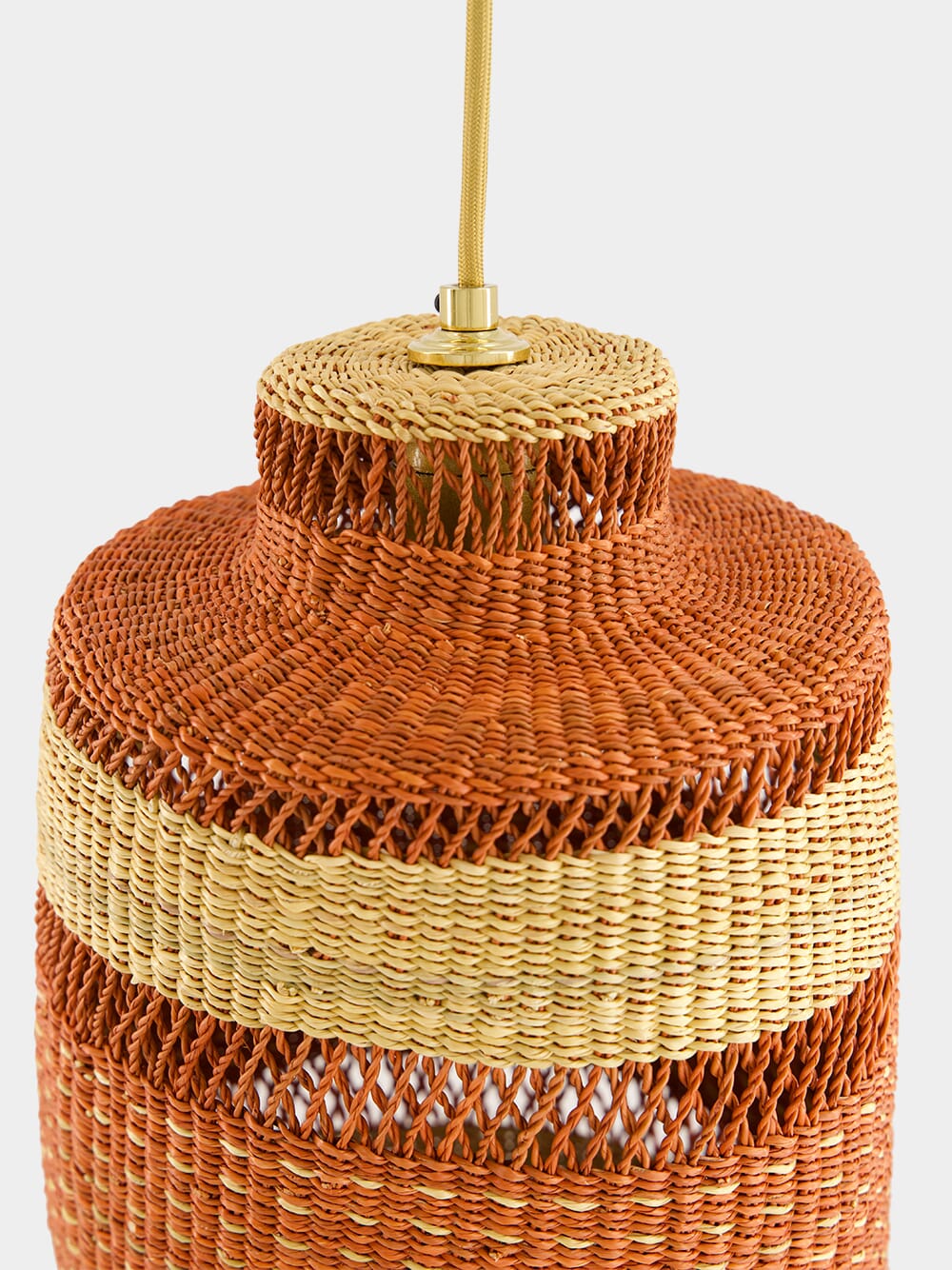 The Dash Pendant Lamp is a compact yet bold lighting accent, handwoven in Ghana and assembled in Barcelona. Featuring alternating bands of natural straw and earthy tones, it is finished with refined brass accessories that enhance its artisanal appeal. Perfect for smaller spaces or clustered installations, it adds texture, warmth, and cultural richness to any interior.