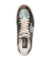 Golden Goose Ball Star black leather sneakers with metallic blue toe, cap and star.