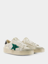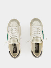 A blend of sport-luxe and vintage flair, these Golden Goose sneakers feature a dynamic composition of smooth cow leather and technical nylon in tones of white, green, silver, and black. The signature star detail and contrast leather heel lend iconic brand DNA, while the multi-fabric lining ensures comfort. Finished with a worn-in rubber sole, this pair delivers Golden Goose’s distinctive balance of artisanal craftsmanship and effortless cool.