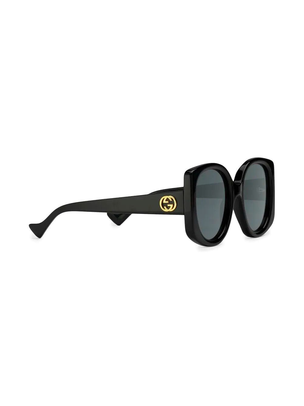 Gucci 1257 geometric frame sunglasses featuring shiny black acetate temples with gold-toned Interlocking G detail.