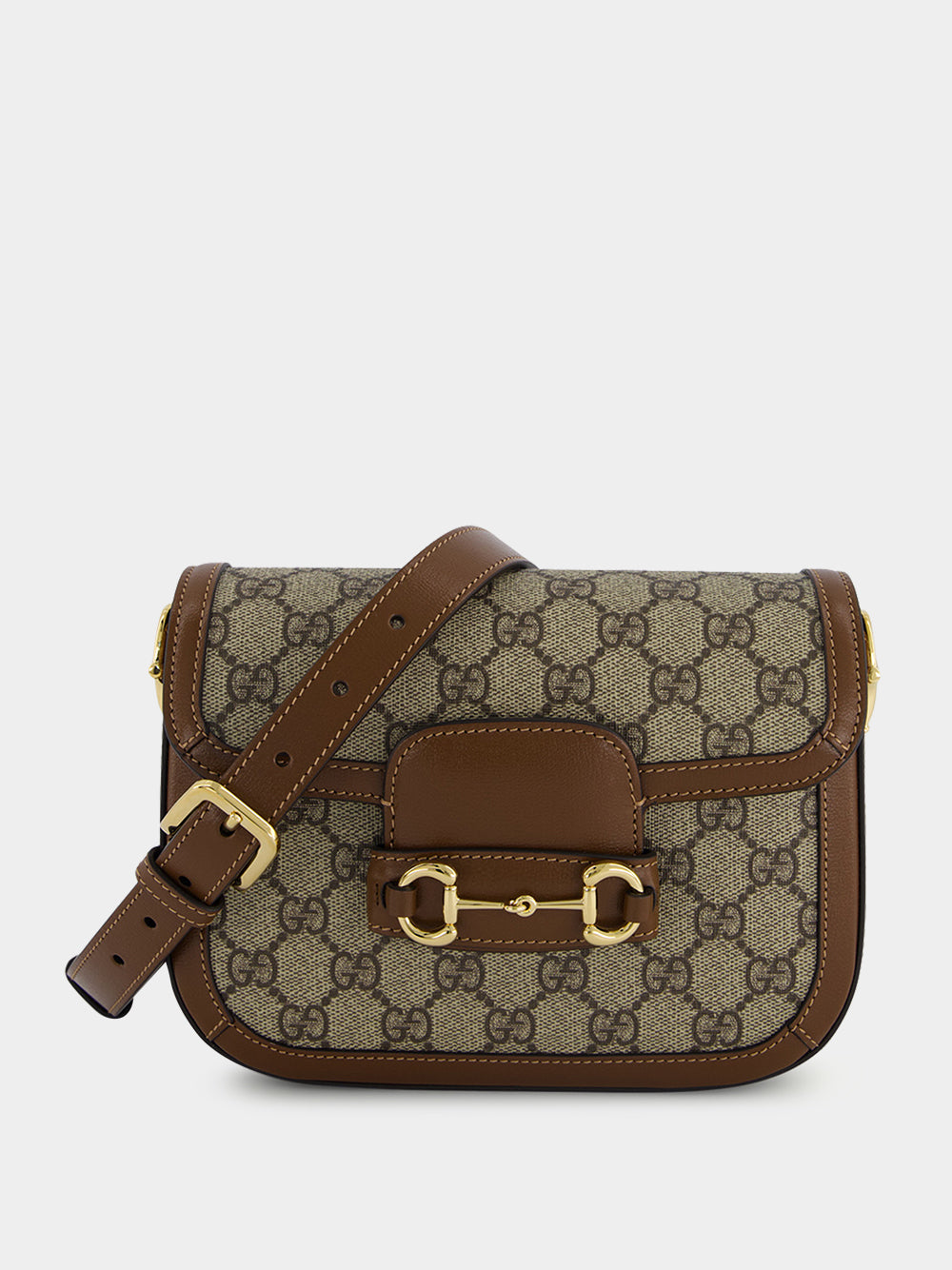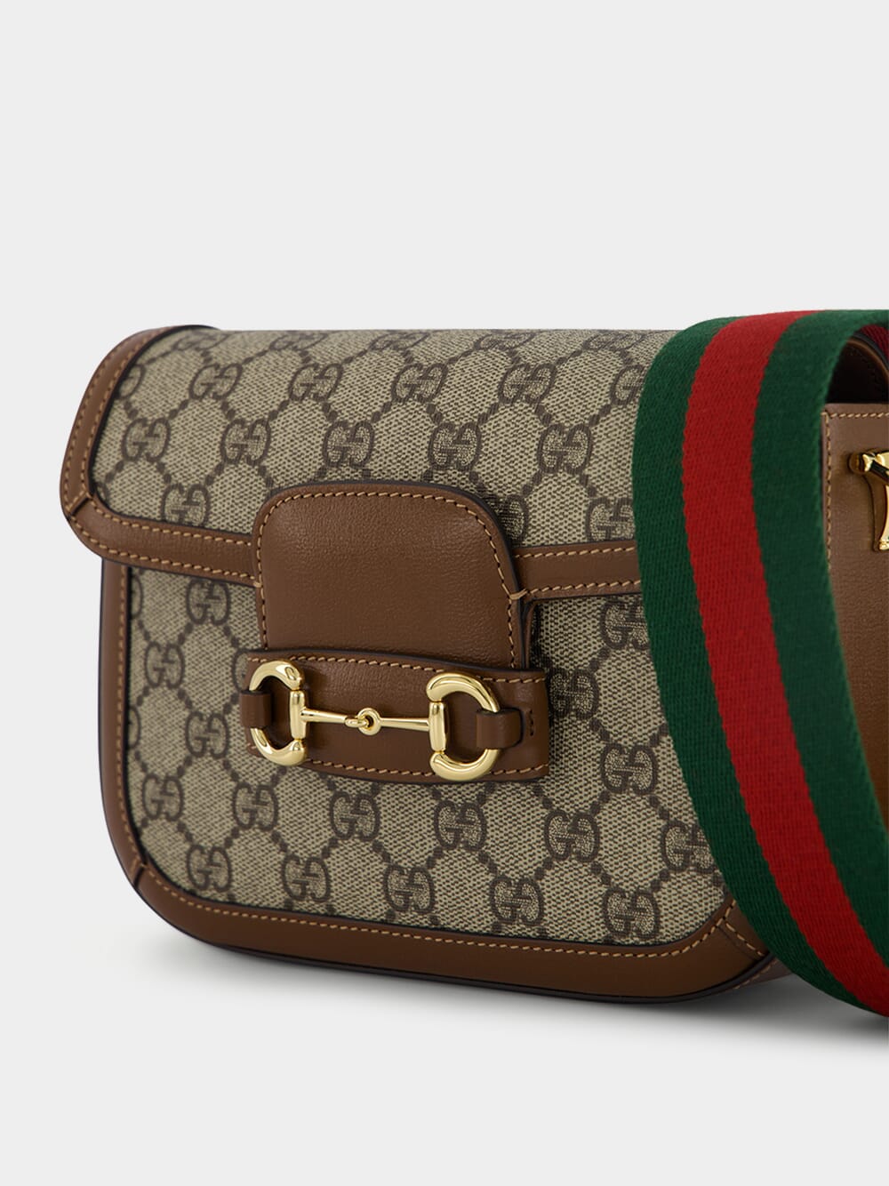 Gucci 1955 Horsebit beige and ebony GG Supreme canvas mini bag with brown leather trim, golden hardware and green and red Web shoulder strap.