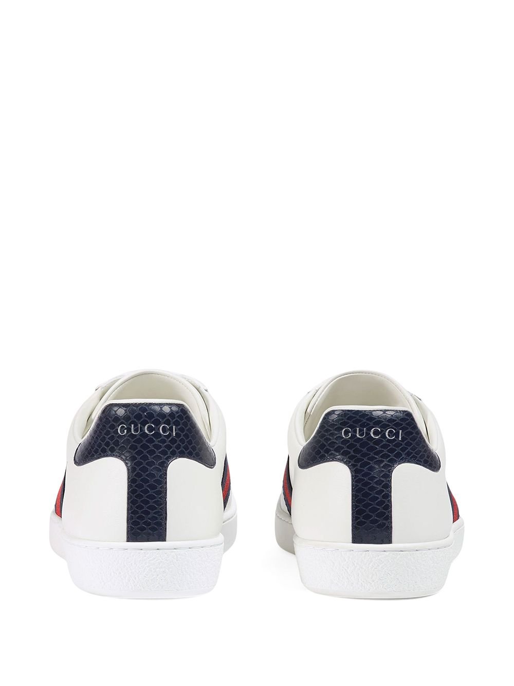 Gucci man's classic low-top white leather sneakers with blue and red Web and blue crocodile detail.
