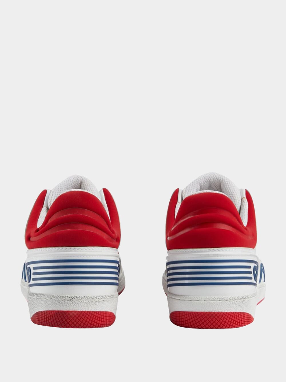 Gucci white leather sneakers with red mesh, perforated cap toe, reflective trim and rubber Interlocking G at the side.