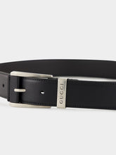 This black leather belt embodies refined elegance with a contemporary edge. Crafted in smooth leather, it features a squared palladium-toned buckle and a metal loop engraved with the Gucci logo. Ideal for both business and formal occasions, the wide silhouette adds structure and sophistication to tailored looks. Made in Italy, it can be styled at the waist or hips.